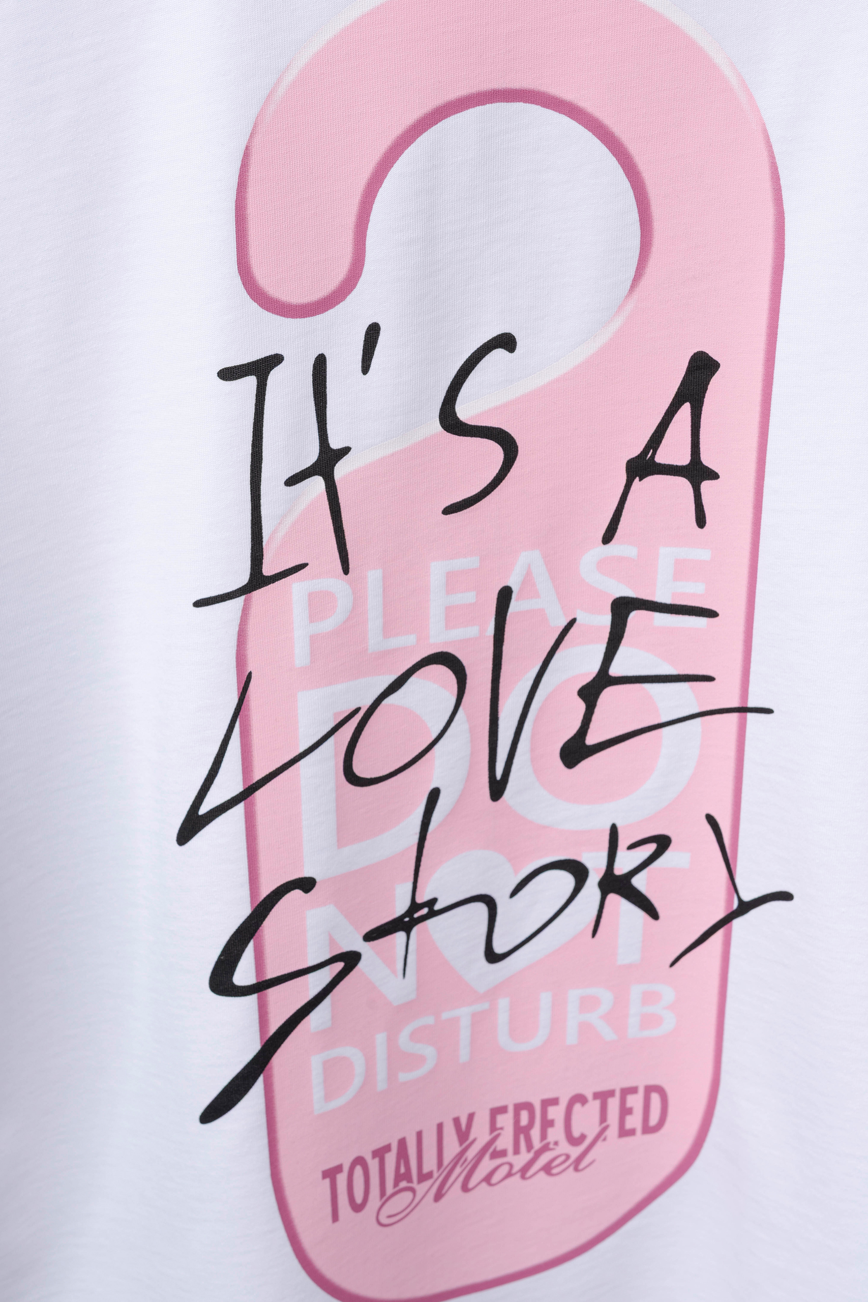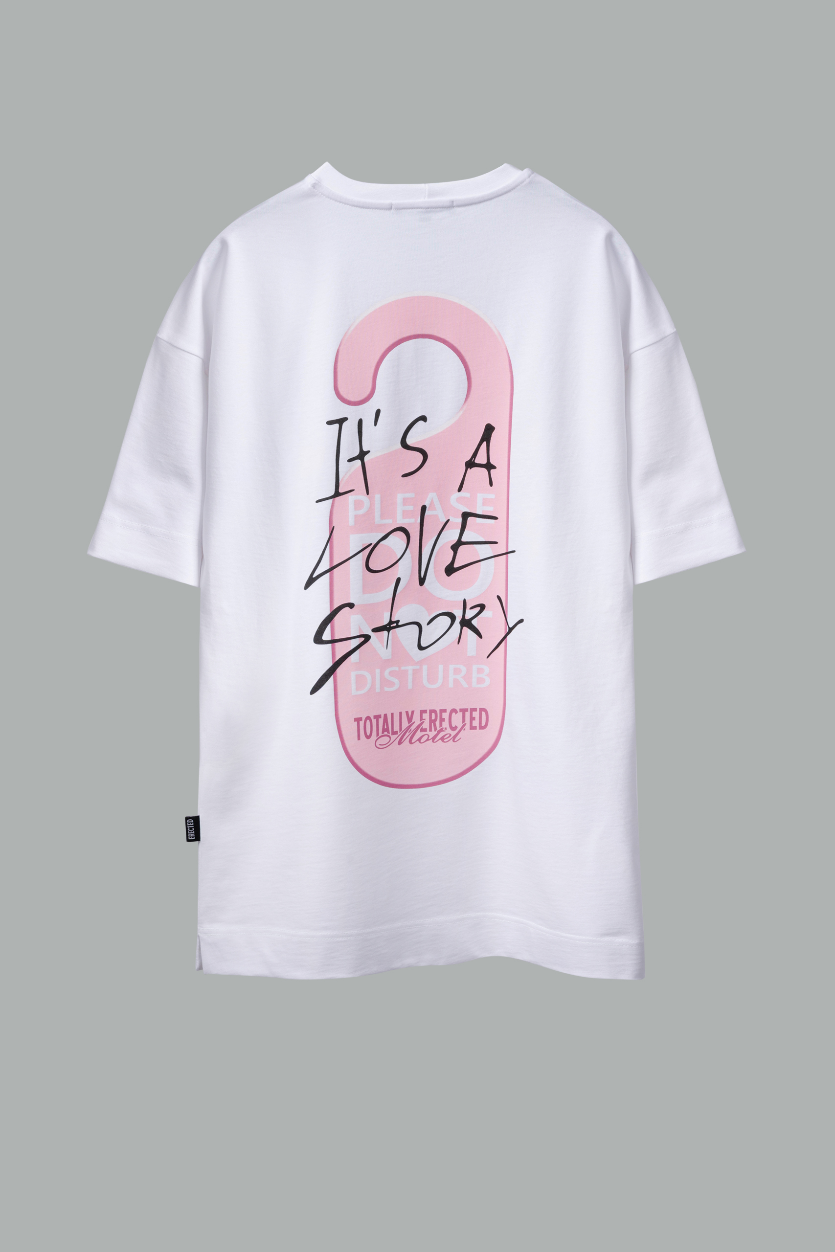 Дамската тениска Totally Erected говори за близост, граници и личен момент. Изчистената предница балансира силното послание на гърба: “Please do not disturb. It’s a love story.”