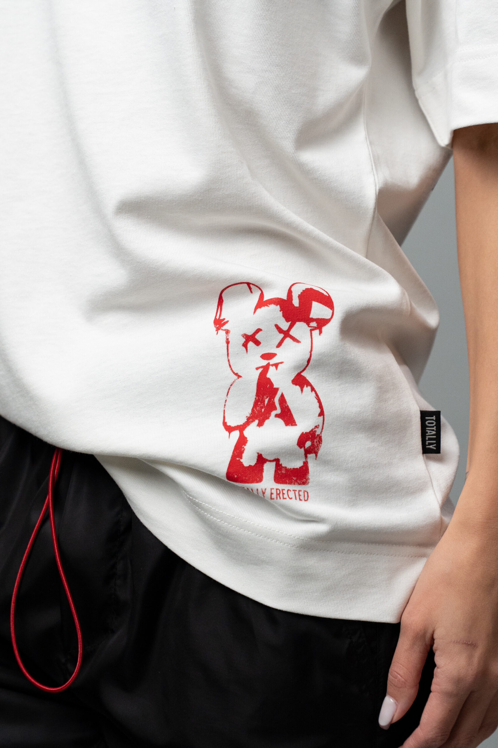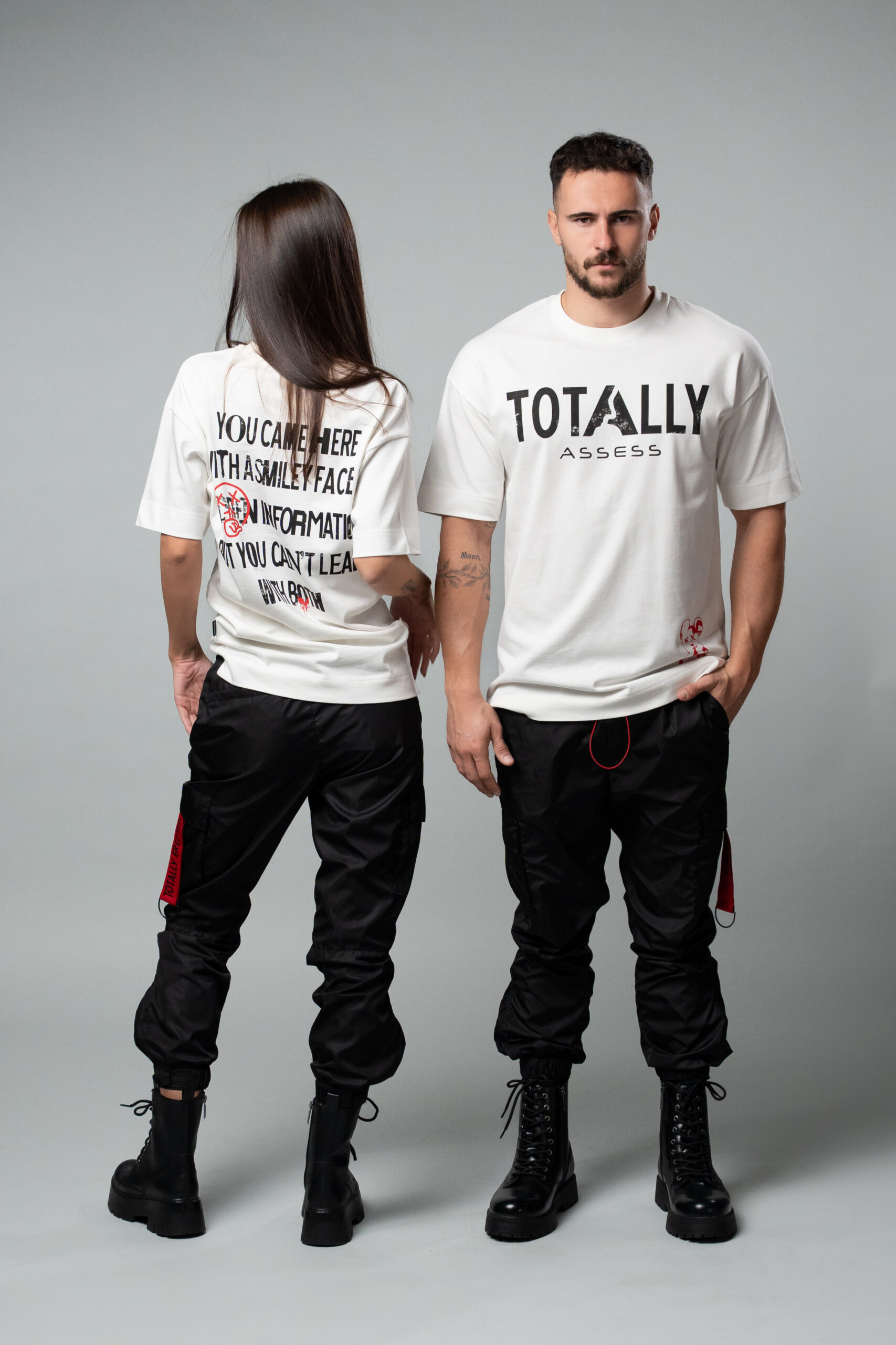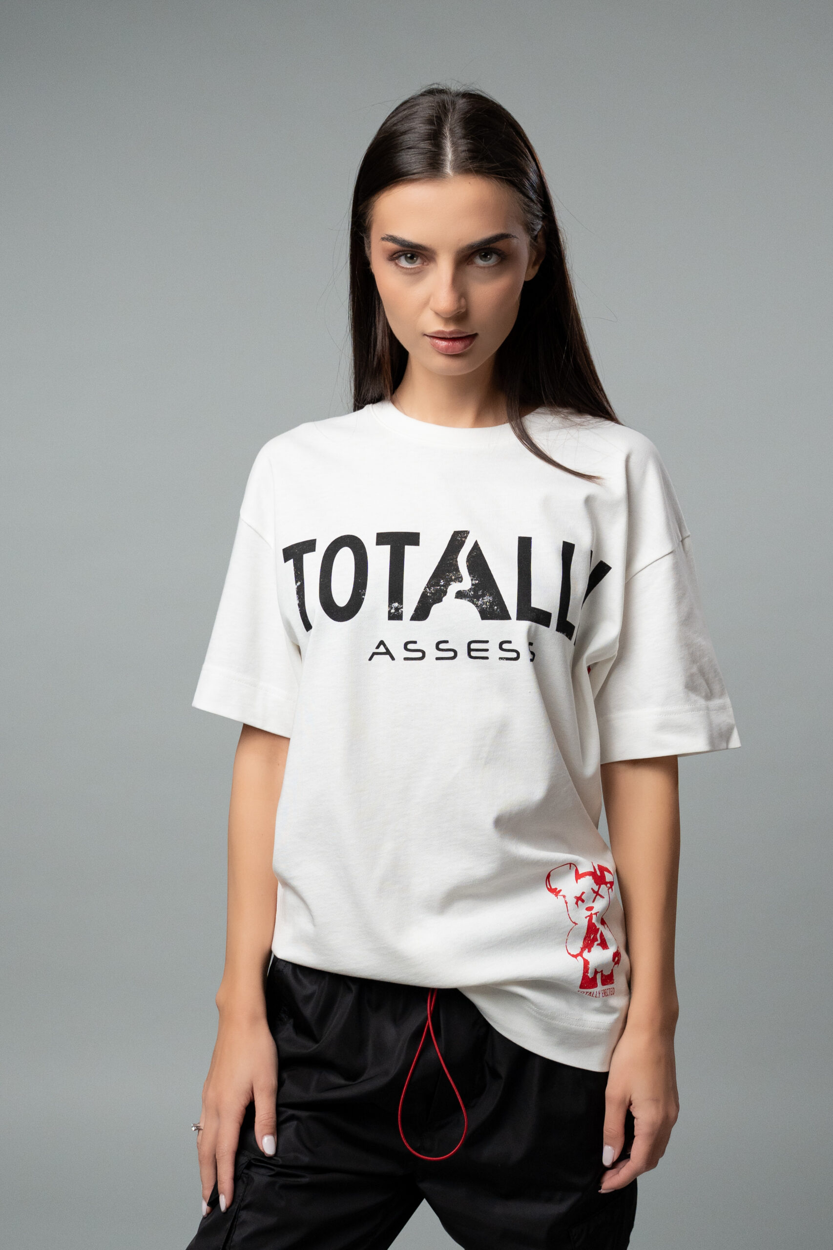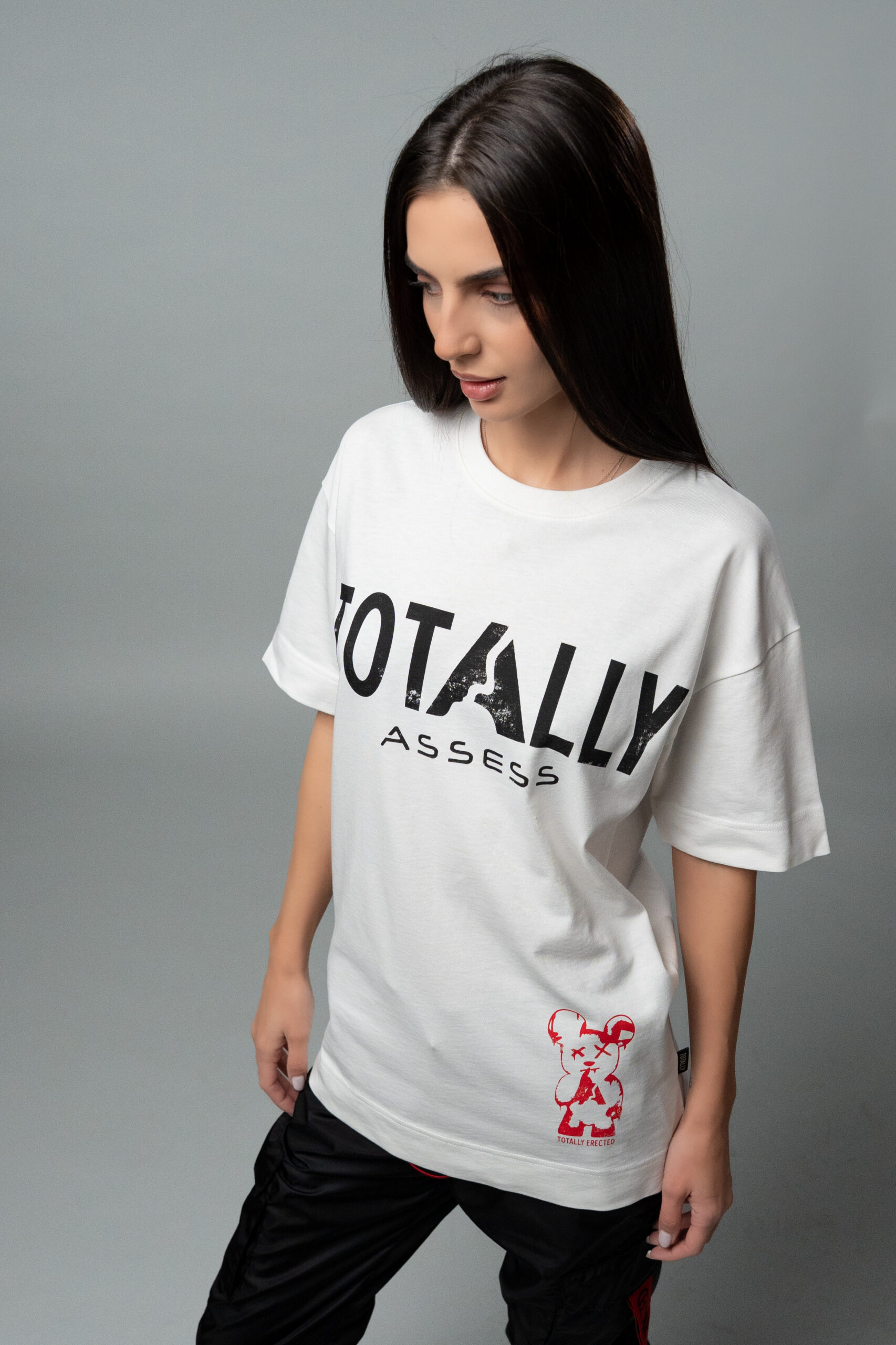 Овърсайз тениска с дизайн TOTALLY ERECTED X ASSESS, изработена от плътна памучна материя в бял цвят.