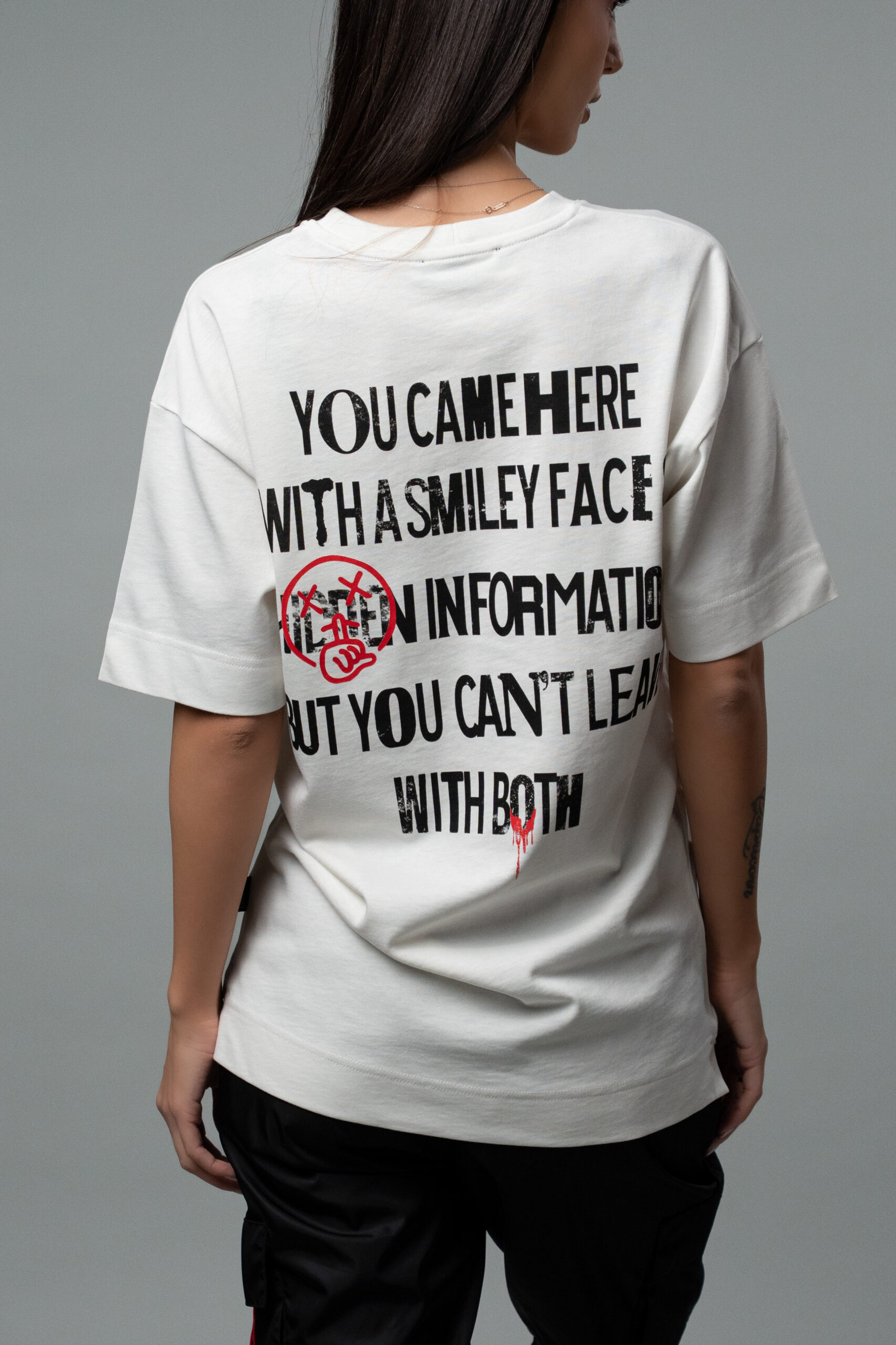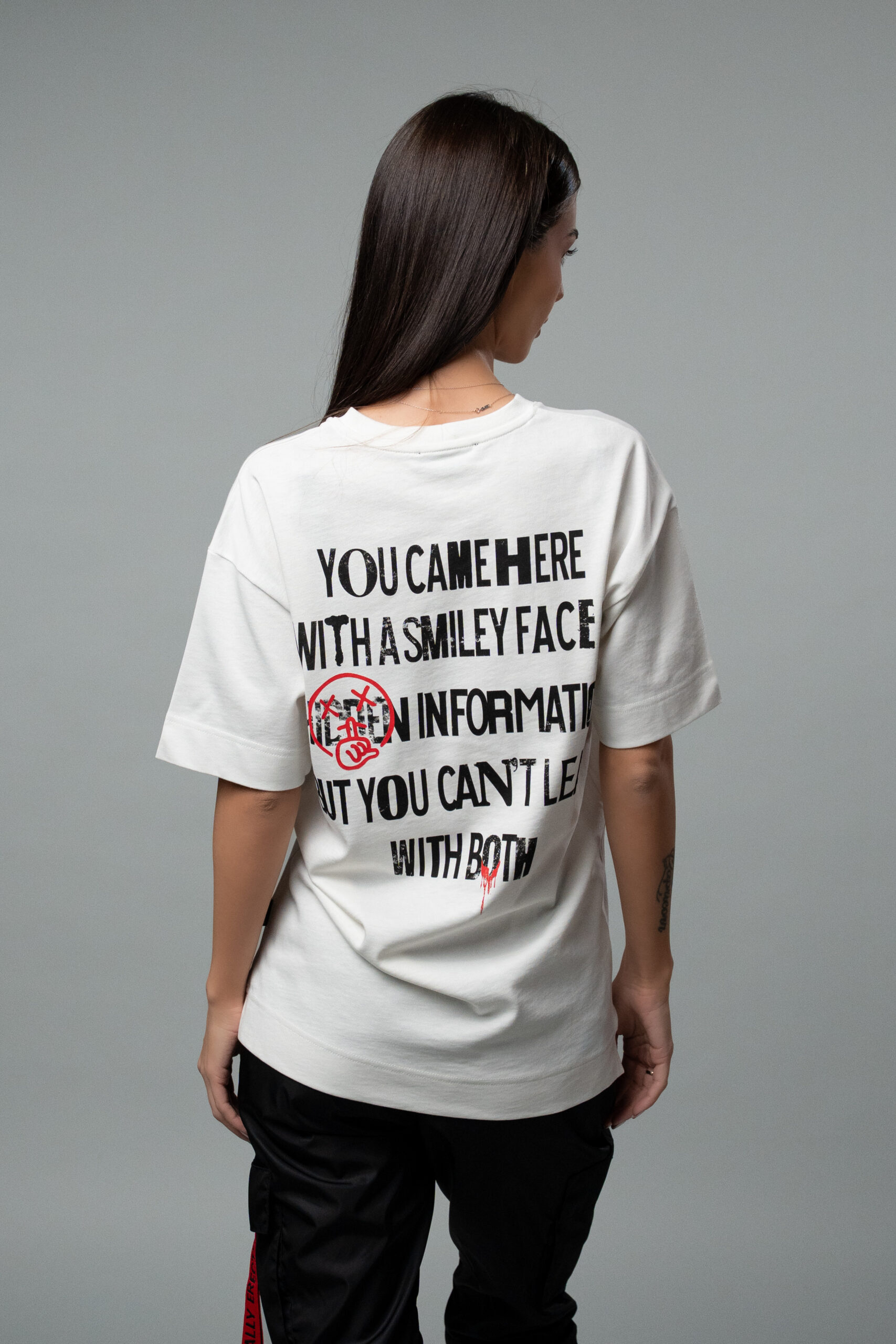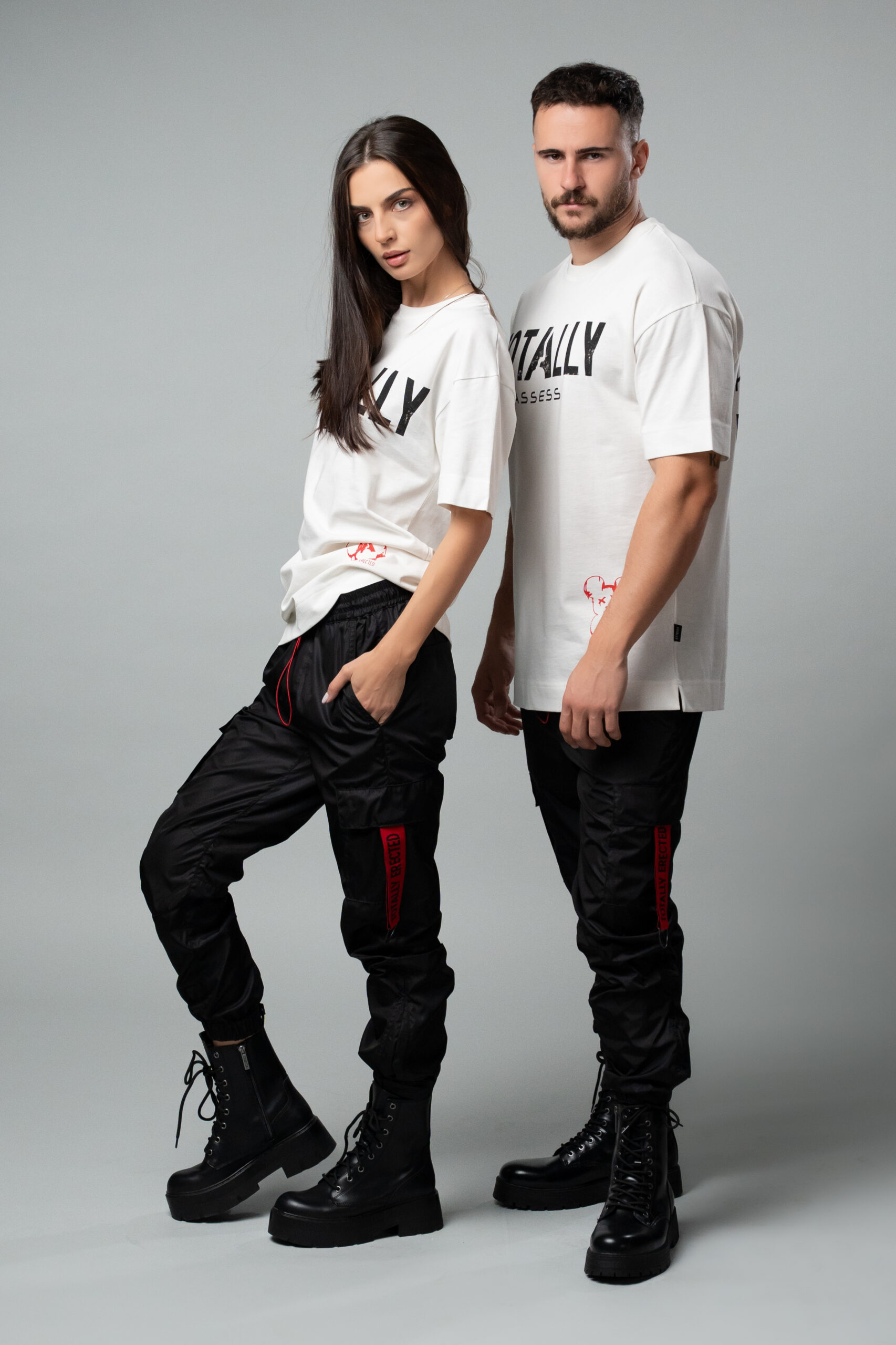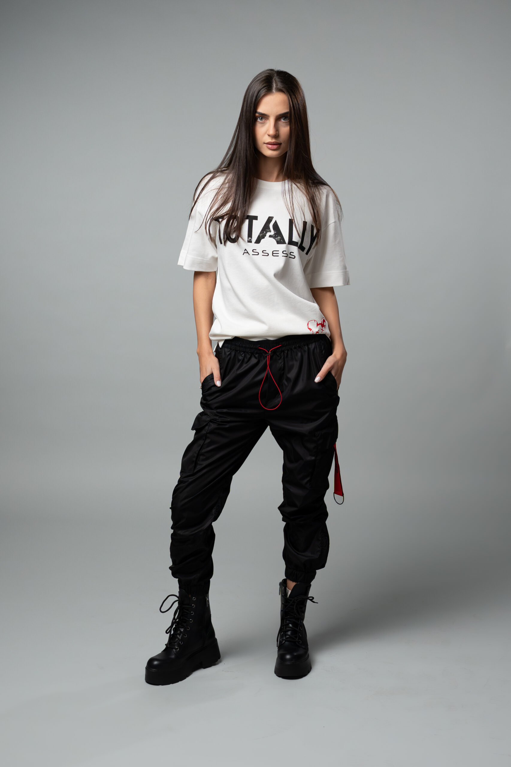 Овърсайз тениска с дизайн TOTALLY ERECTED X ASSESS, изработена от плътна памучна материя в бял цвят.