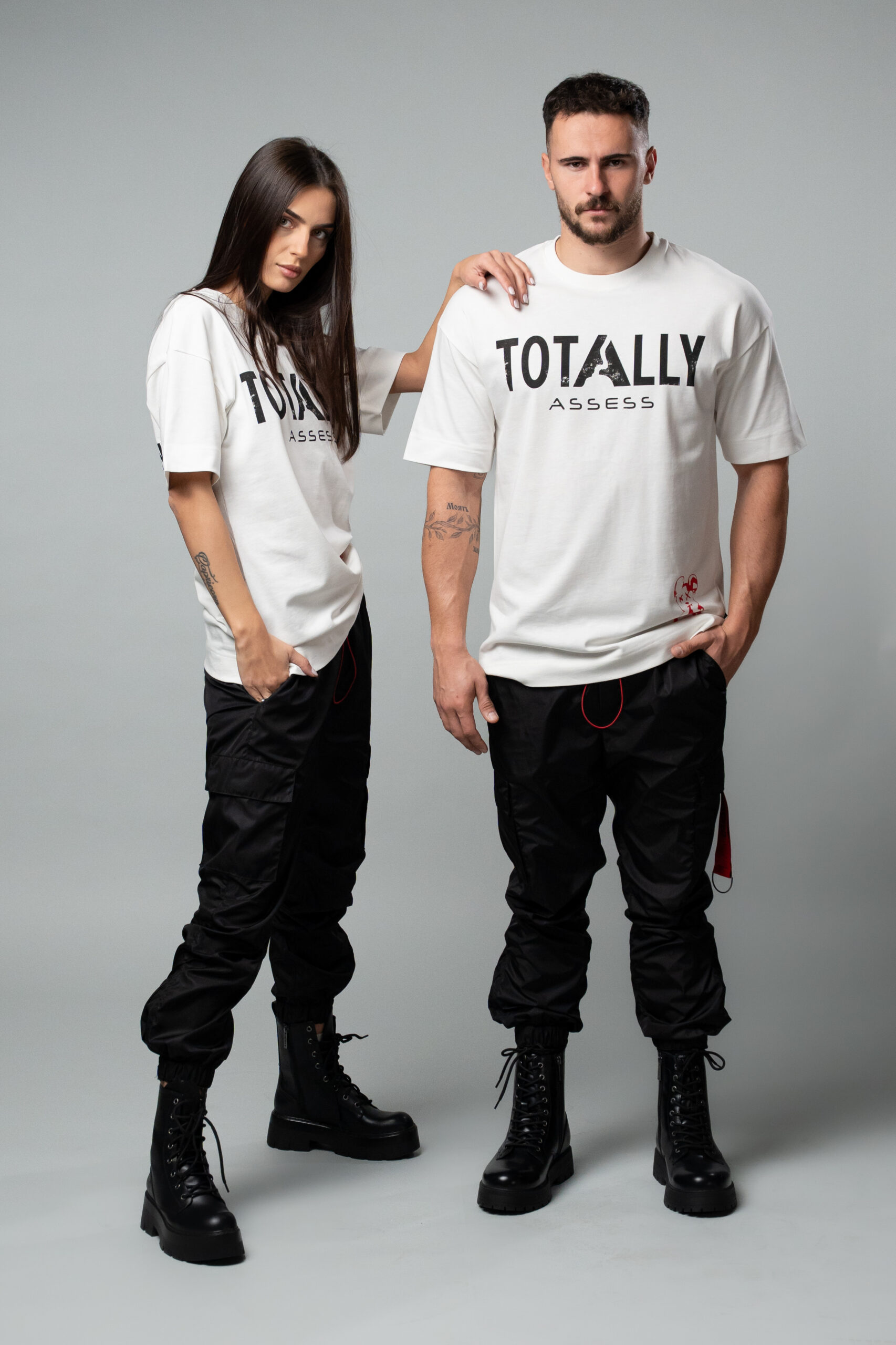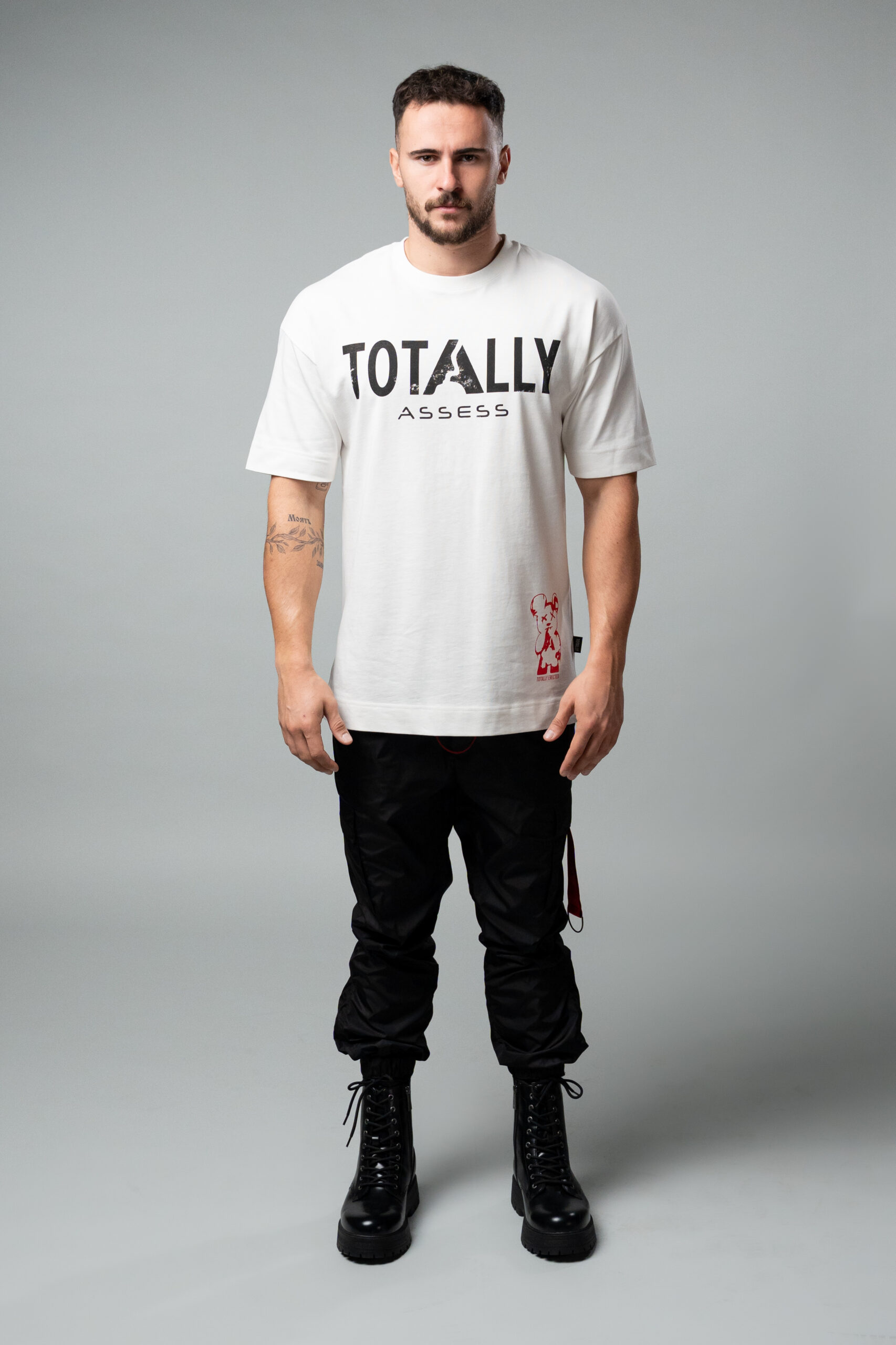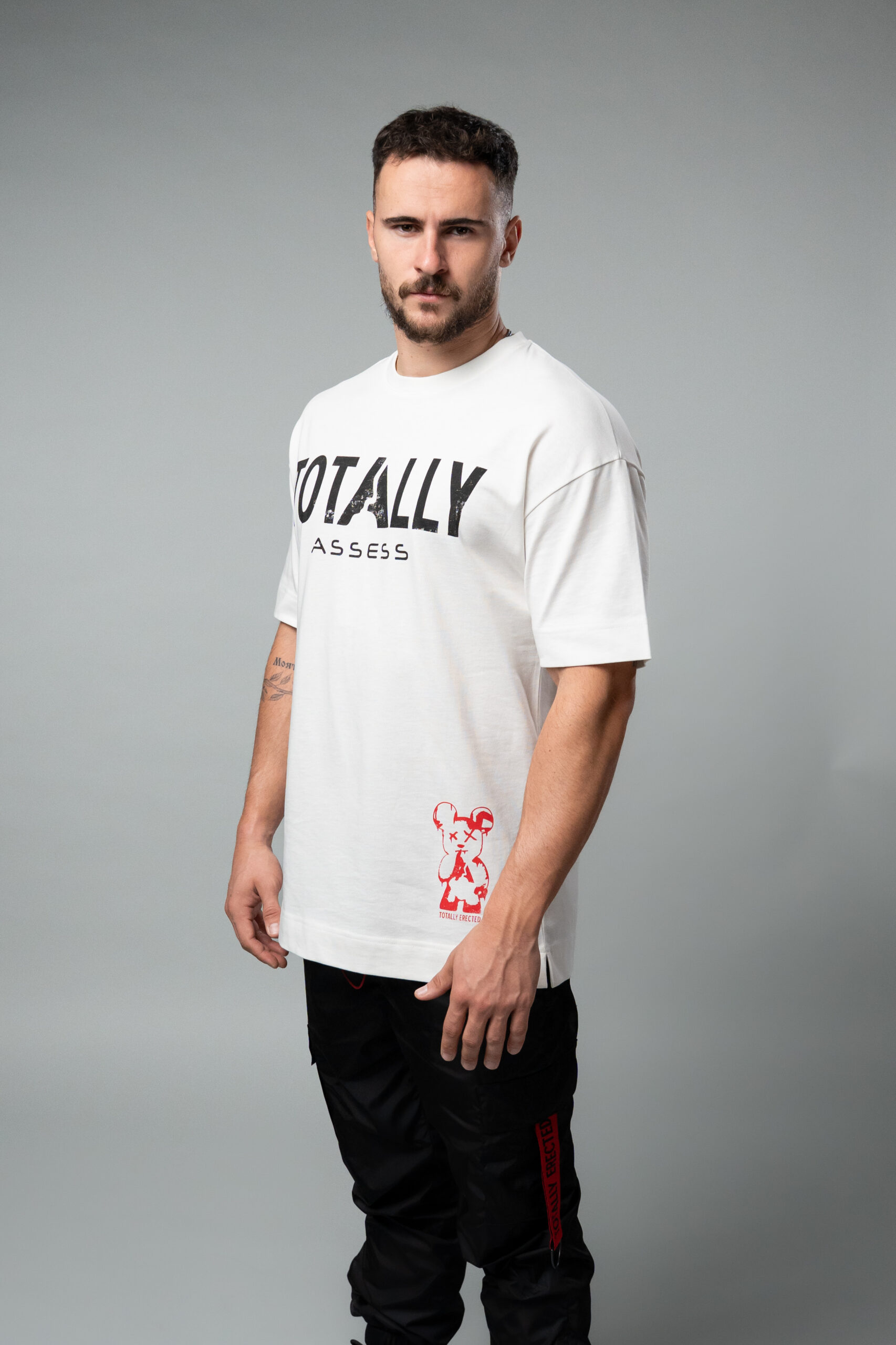 Овърсайз тениска с дизайн TOTALLY ERECTED X ASSESS, изработена от плътна памучна материя в бял цвят.