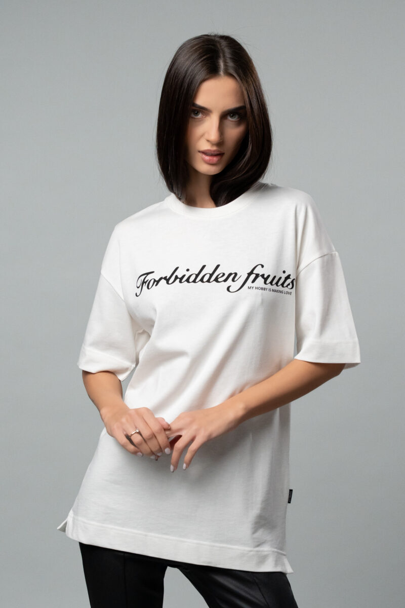 Тениската е със свободна кройка, овално деколте, къс ръкав и странични цепки на подгъва.