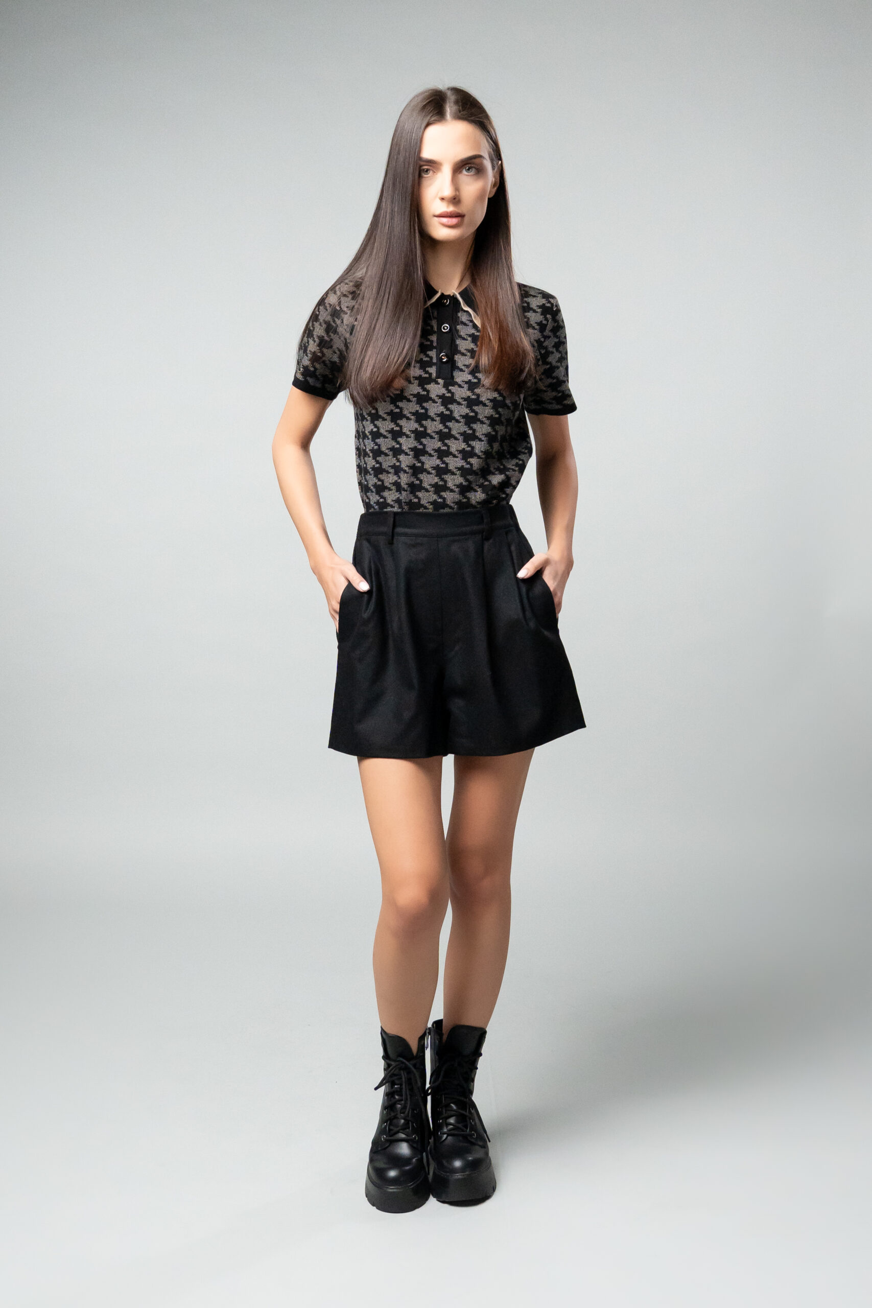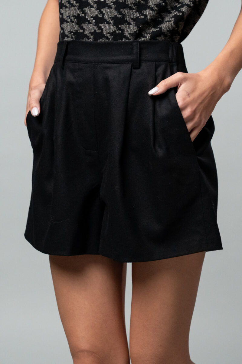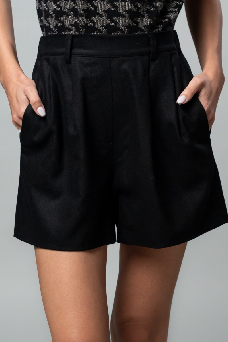 Дамски къси панталони с висока талия от TOTALLY ERECTED. Изработени от висококачествена вълнена материя, късите панталони съчетават удобство и усещане за стил. Високата талия подчертава силуета и осигурява комфорт през целия ден. Моделът е с ластик на талията, но има възможност да се добави и колан. Късите панталони имат два функционални джоба отстрани, а дължината им е подходяща, както за ежедневни, така и за по-елегантни визии. Съчетават се идеално със сакото от същата серия.