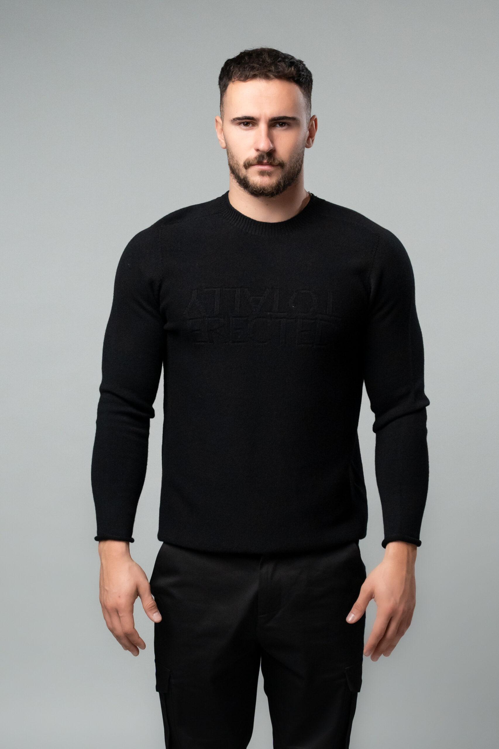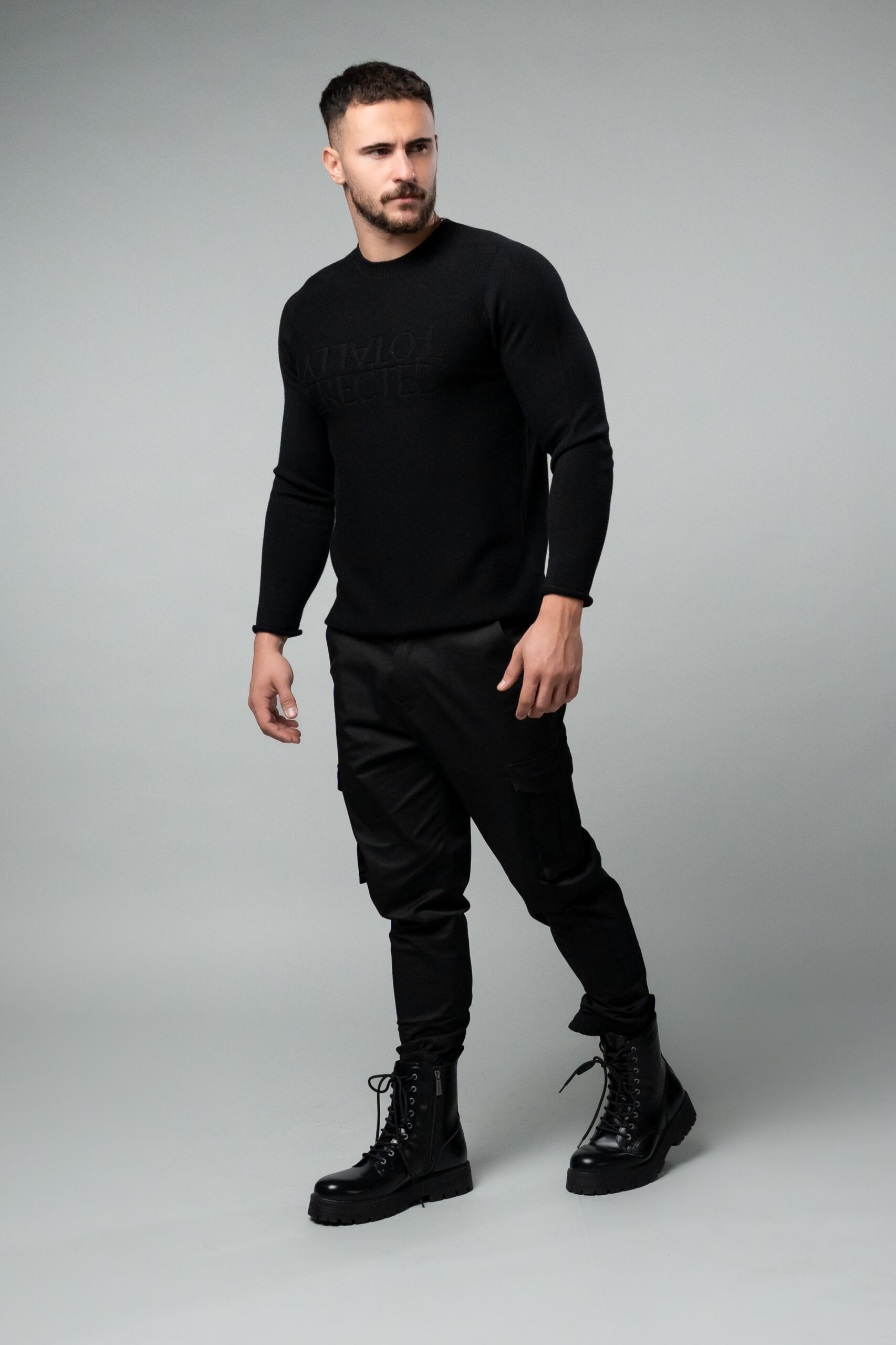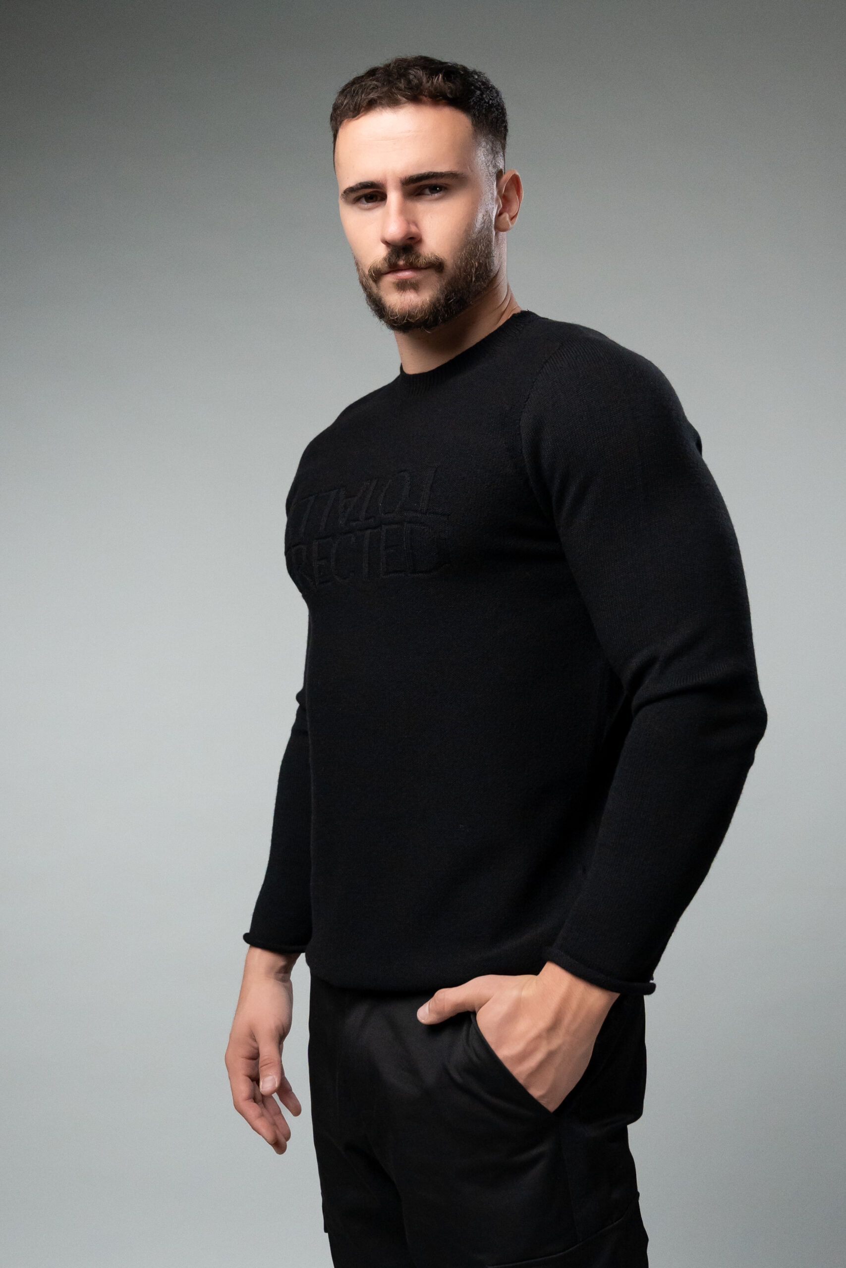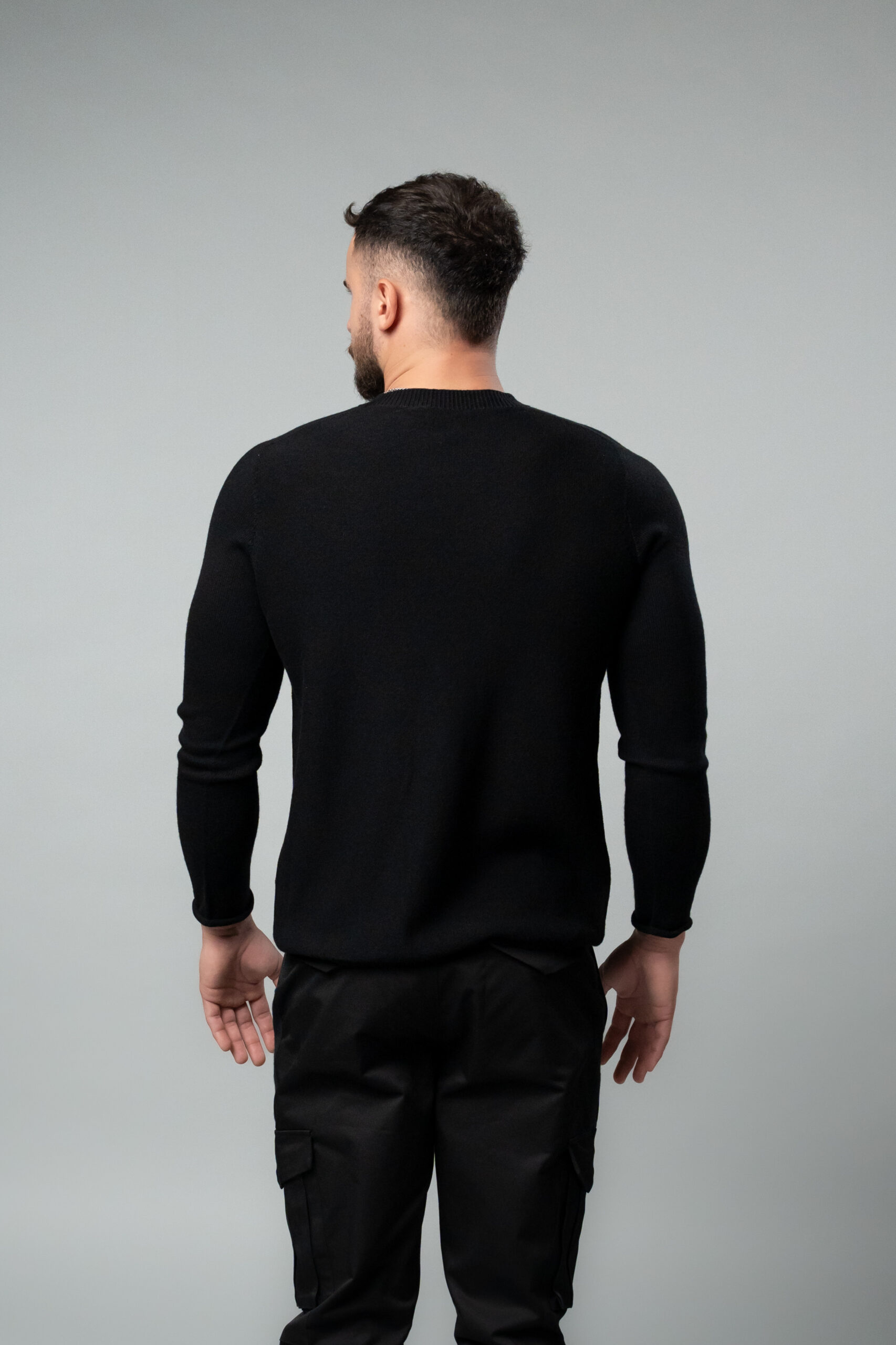 Пуловер в черен цвят. Изработен е от чиста вълна, която е обработена така, че да не създава дискомфортно усещане при носене, а точно обратното. Мек на допир пуловер, напълно безшевен.