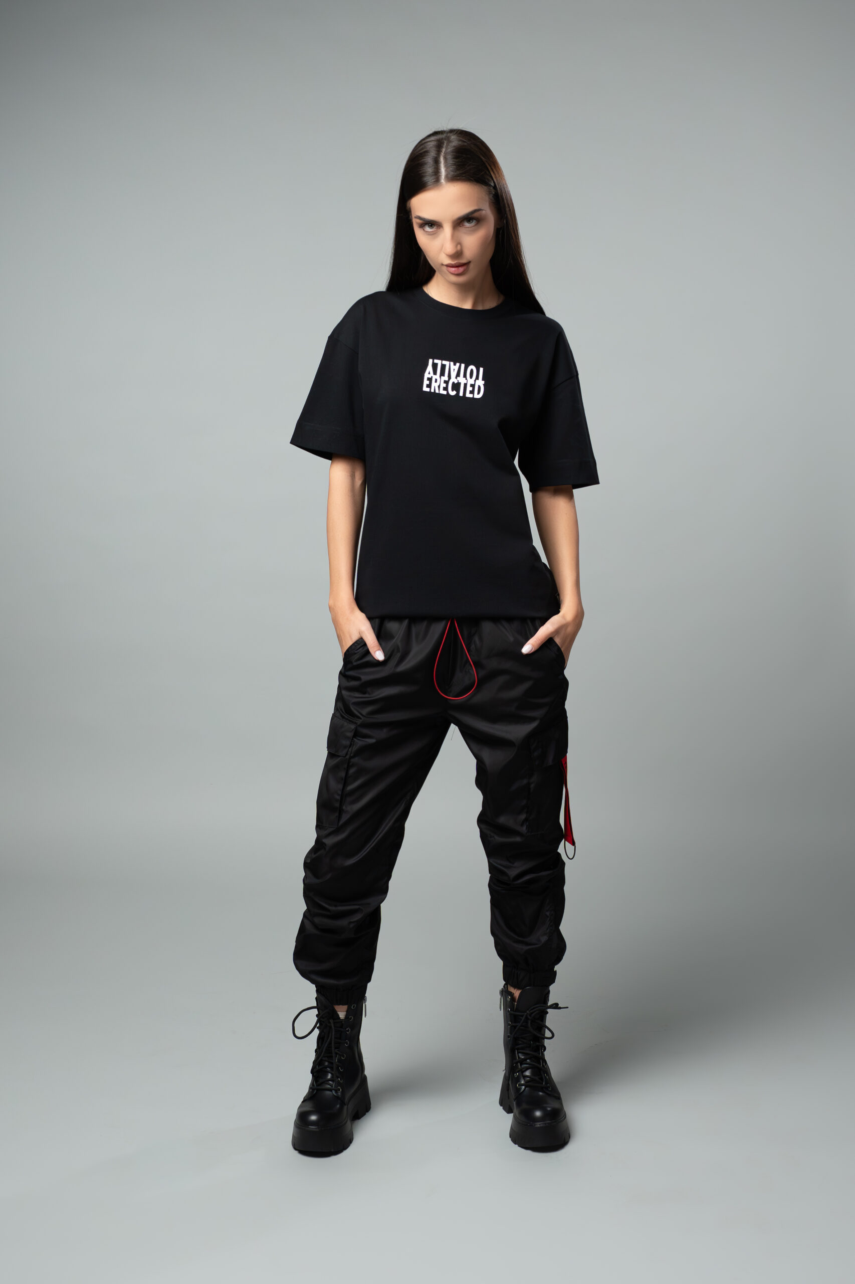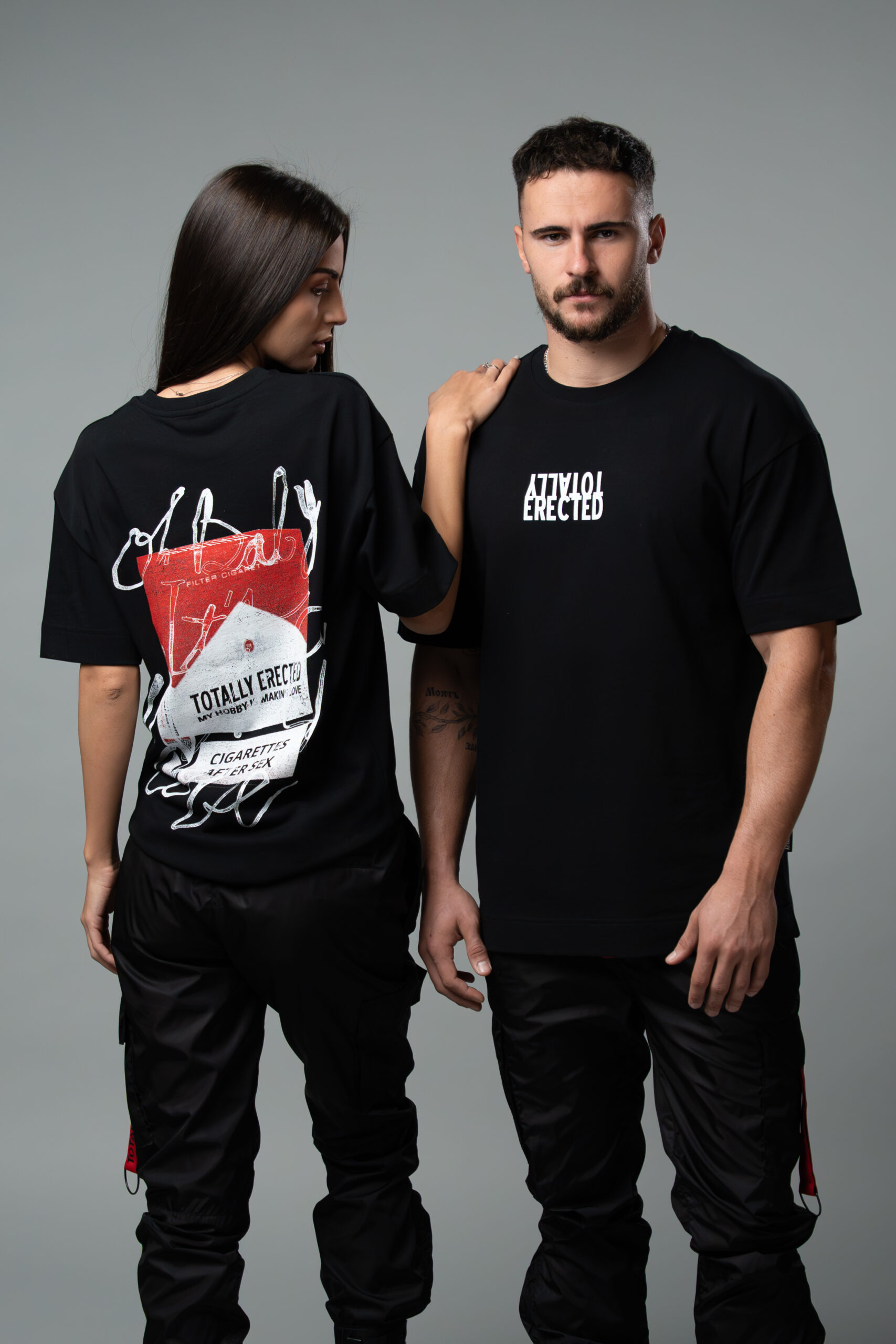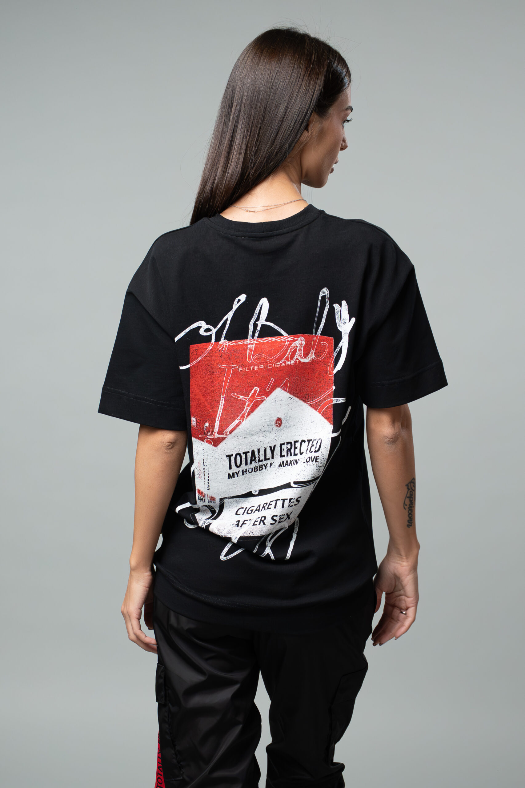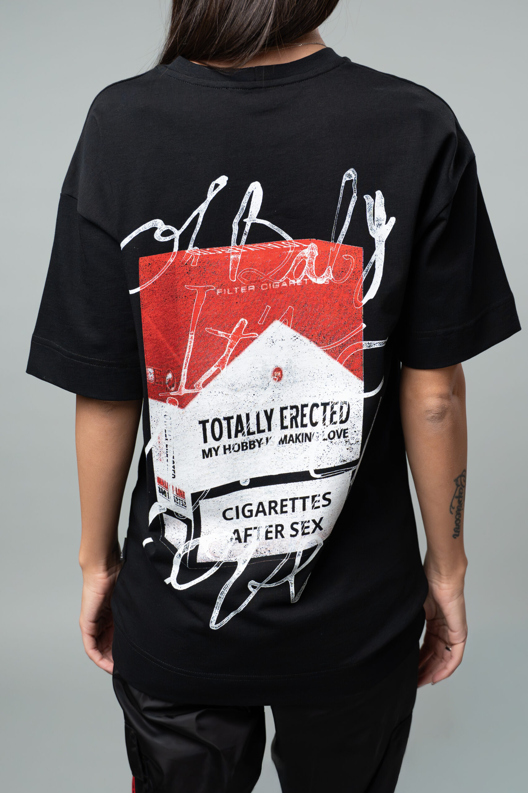 Овърсайз тениска с дизайн от TOTALLY ERECTED, изработена от плътна памучна материя в черен цвят.