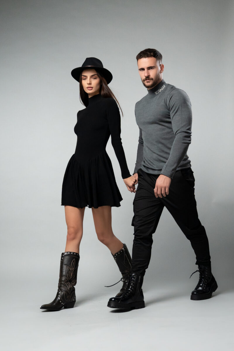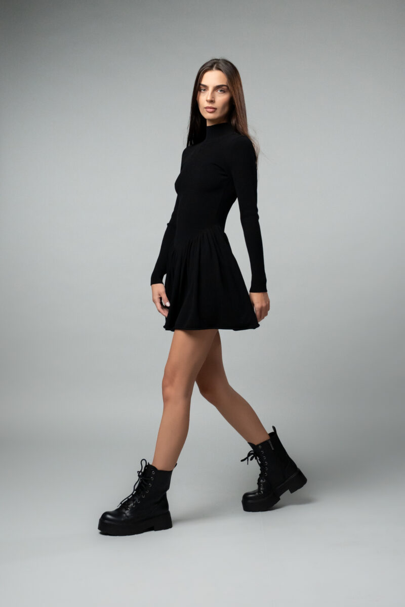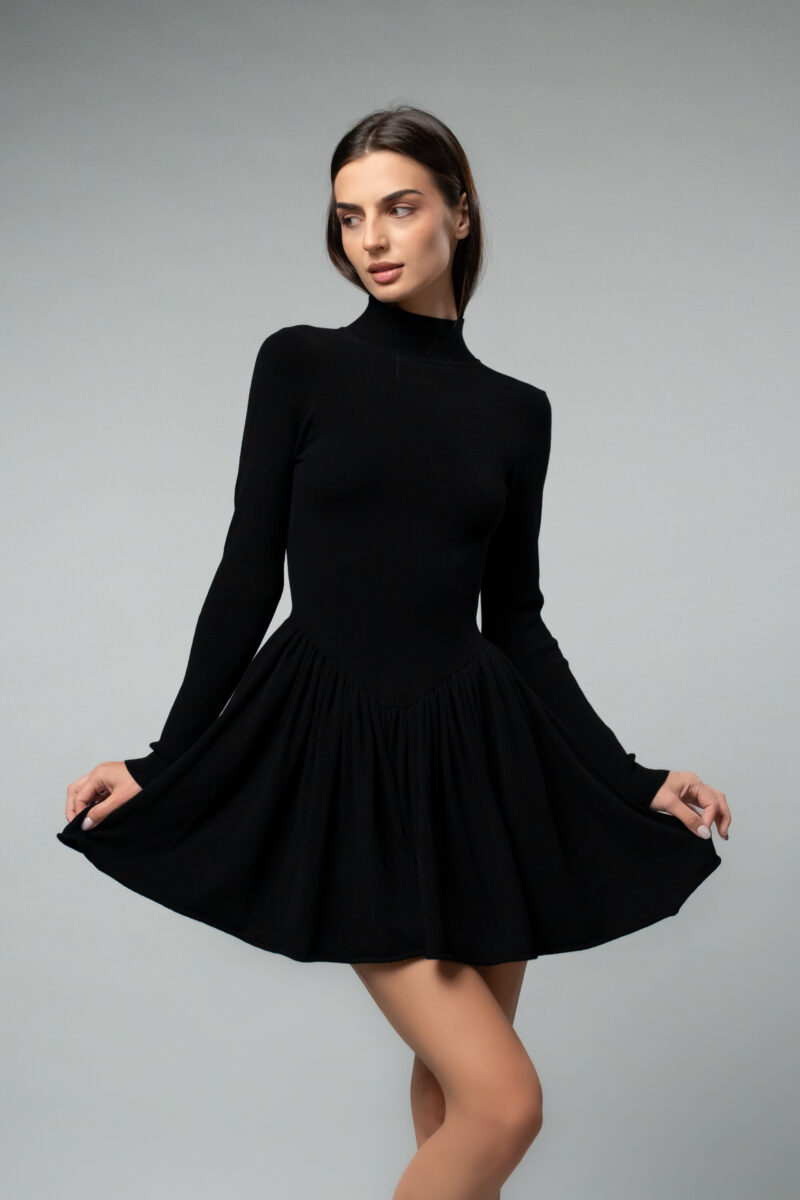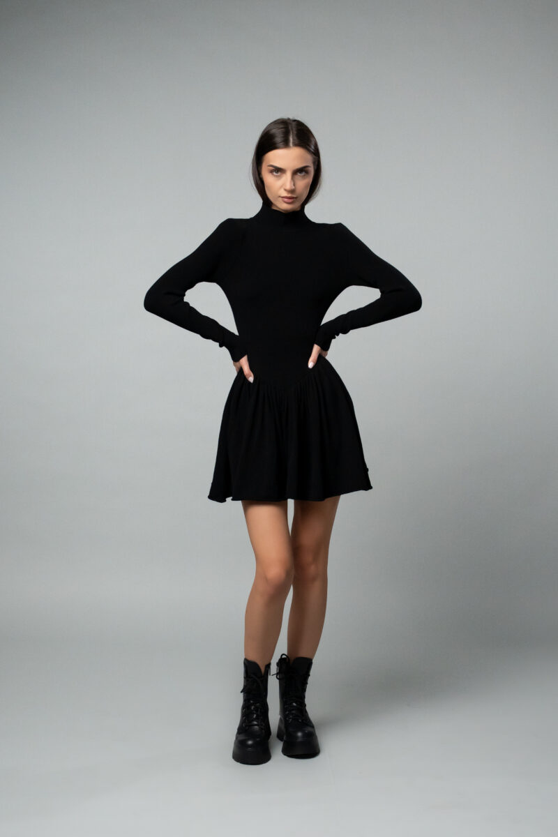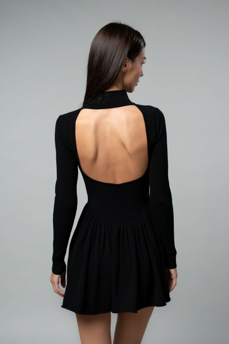 Къса плетена рокля от TOTALLY ERECTED. Роклята е изработена от меко плетиво в класически черен цвят. Моделът е втален по тялото, но се разкроява плавно в ханша, което придава елегантност и женственост. Роклята с дълъг ръкав и поло яка. Акцент е елегантно отвореният гръб, който придава контраст на изчистената предна част. Подходяща е, както за ежедневни, така и за по-елегантни визии.
