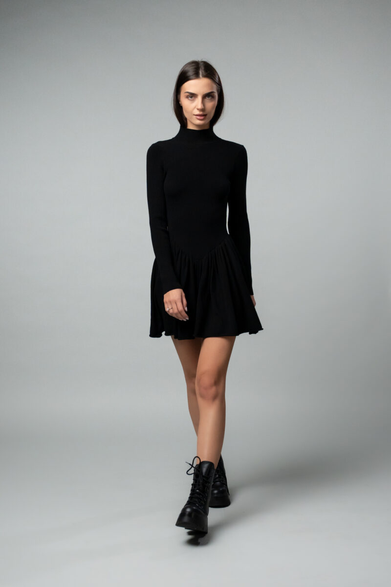 Къса плетена рокля от TOTALLY ERECTED. Роклята е изработена от меко плетиво в класически черен цвят. Моделът е втален по тялото, но се разкроява плавно в ханша, което придава елегантност и женственост. Роклята с дълъг ръкав и поло яка. Акцент е елегантно отвореният гръб, който придава контраст на изчистената предна част. Подходяща е, както за ежедневни, така и за по-елегантни визии.