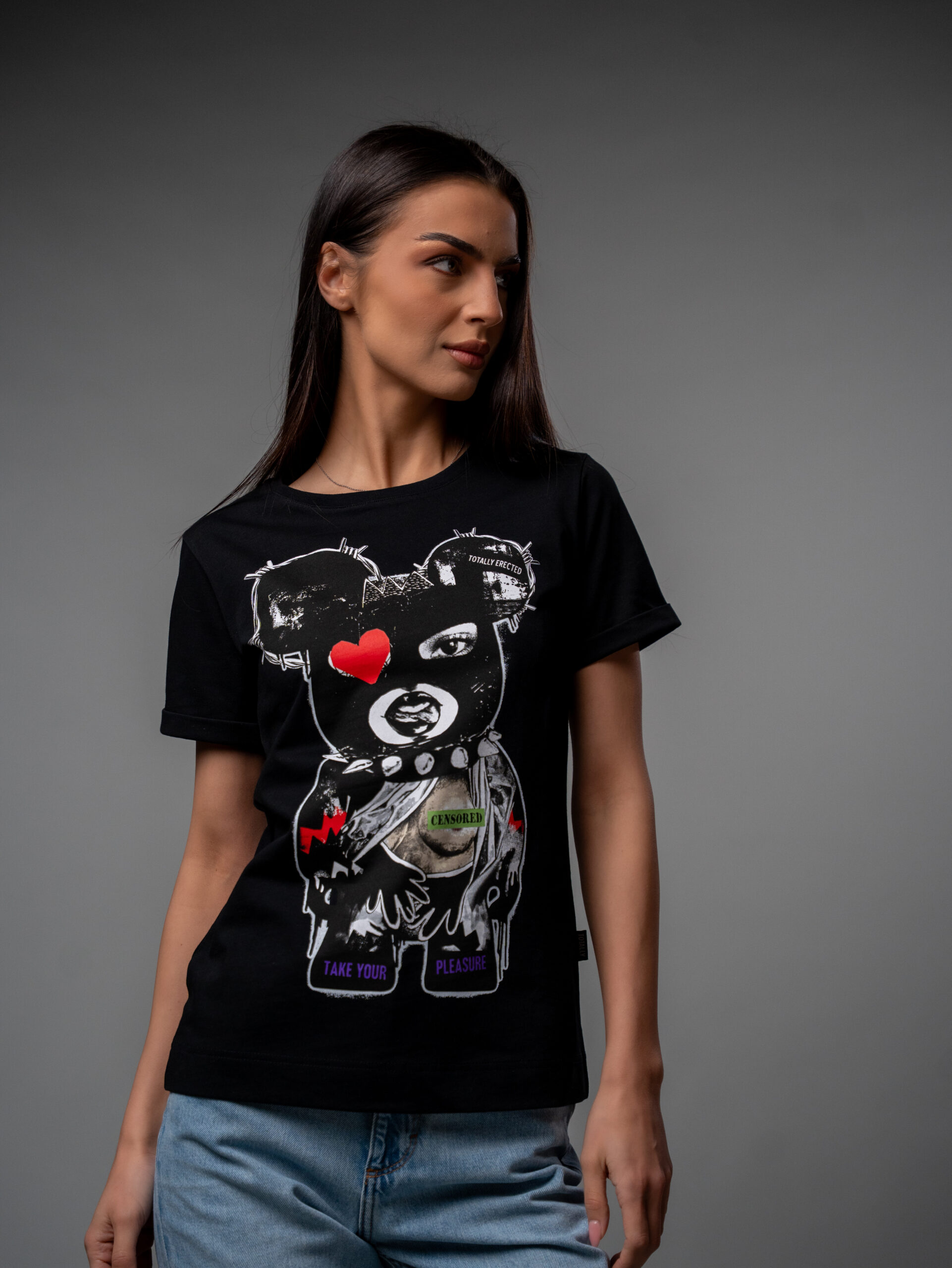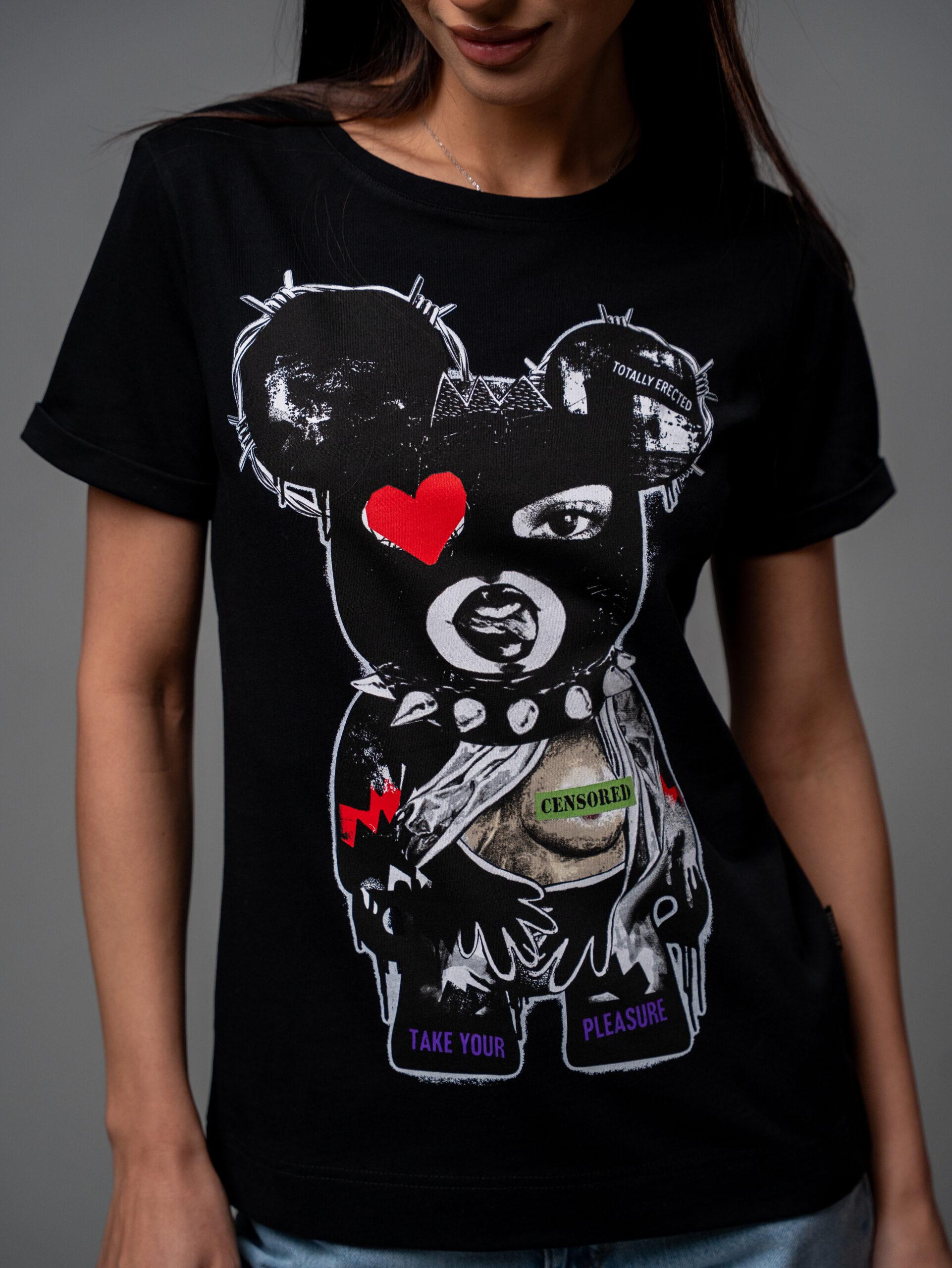 Дамската тениска Totally Erected играе с темите за желание, свобода и личен избор. Артистичният bear graphic с „CENSORED“ и „TAKE YOUR PLEASURE“ казва всичко, без да обяснява нищо. Секси, иронична и уверена – точно както трябва.