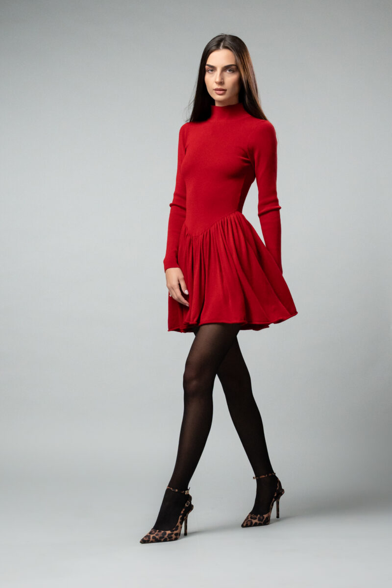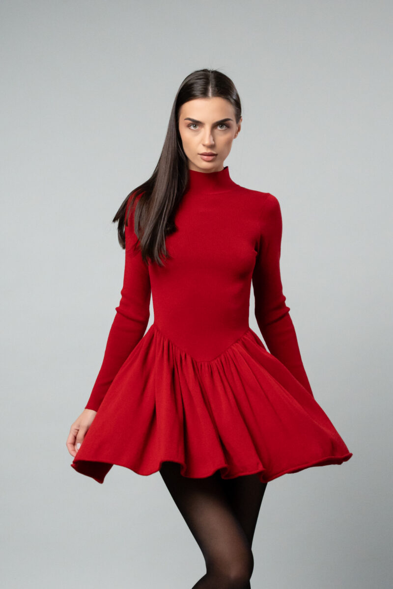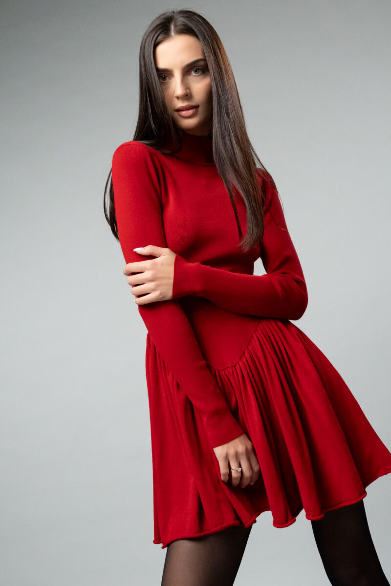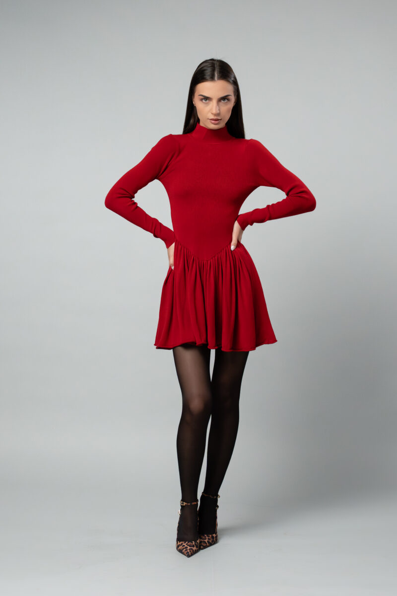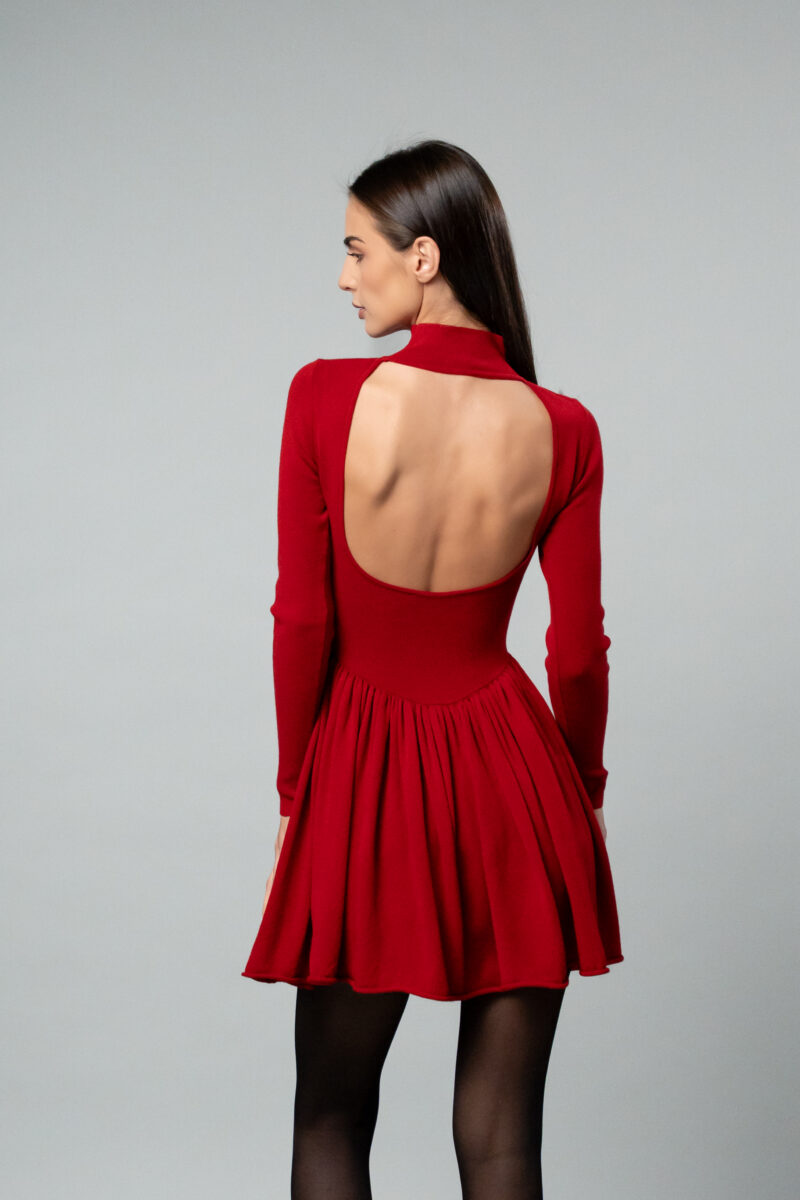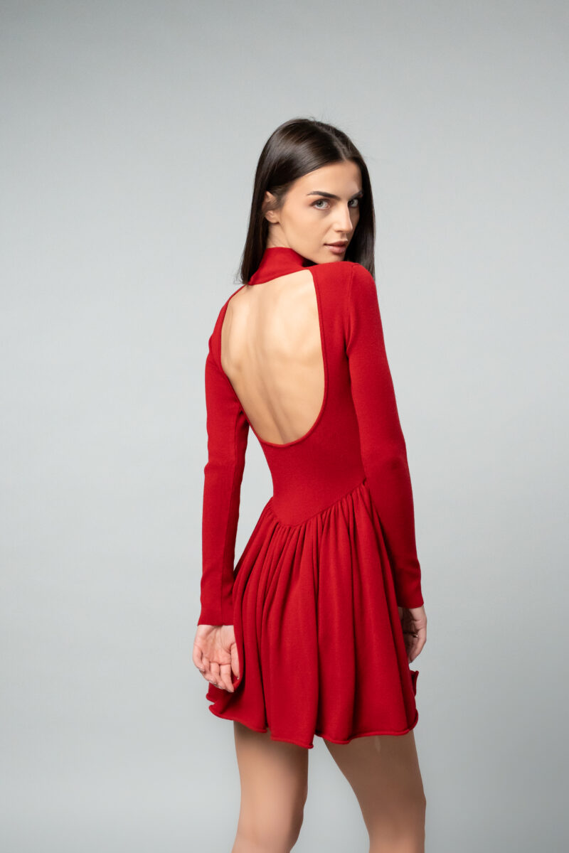Къса плетена рокля от TOTALLY ERECTED. Роклята е изработена от меко плетиво в класически червен цвят. Моделът е втален по тялото, но се разкроява плавно в ханша, което придава елегантност и женственост. Роклята с дълъг ръкав и поло яка. Акцент е елегантно отвореният гръб, който придава контраст на изчистената предна част. Подходяща е, както за ежедневни, така и за по-елегантни визии.
