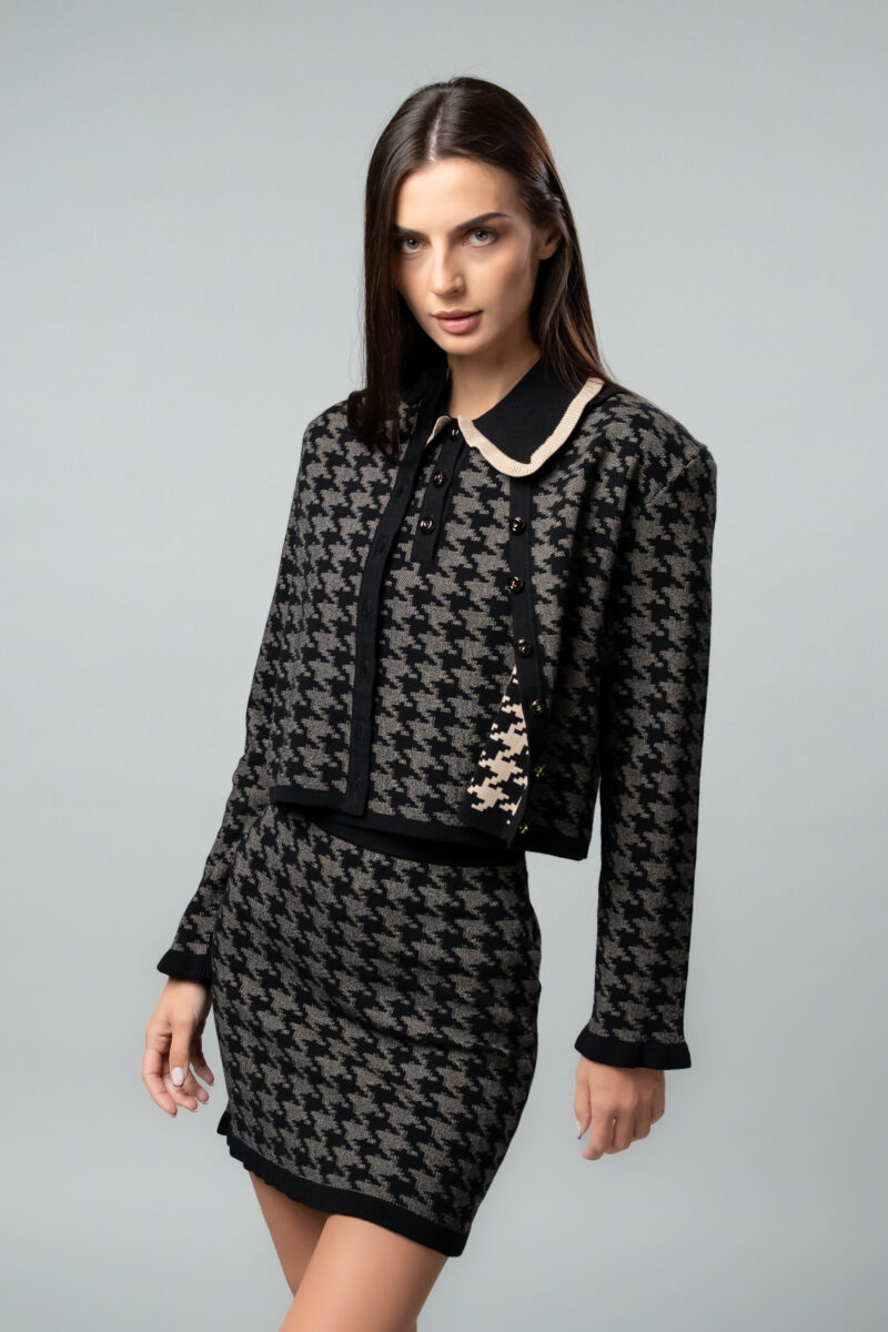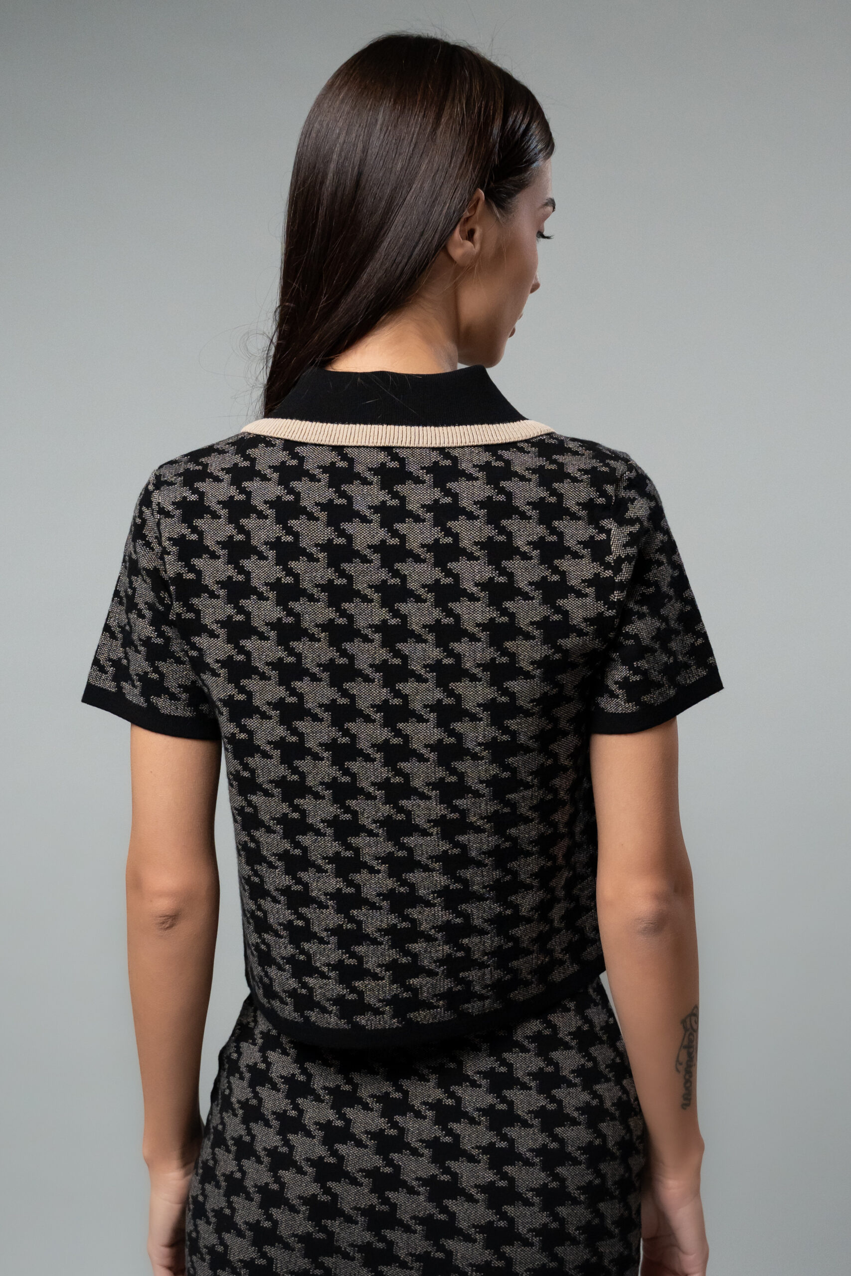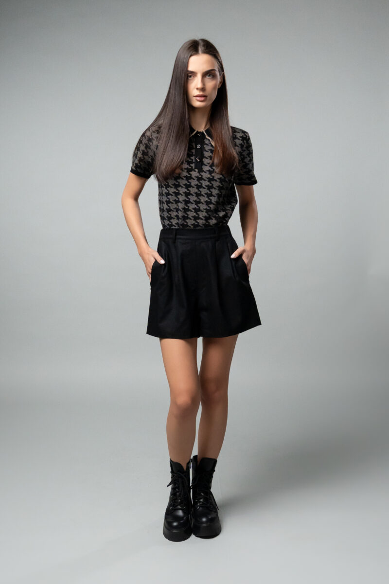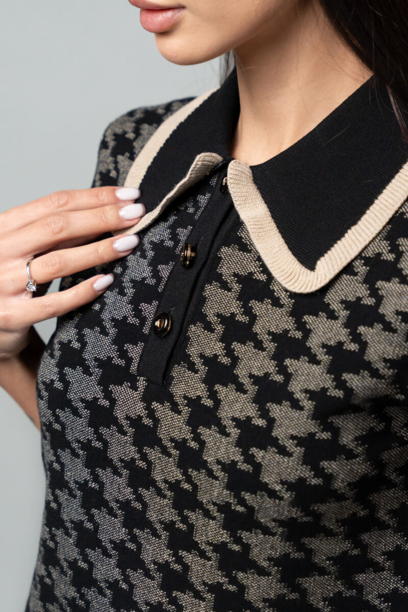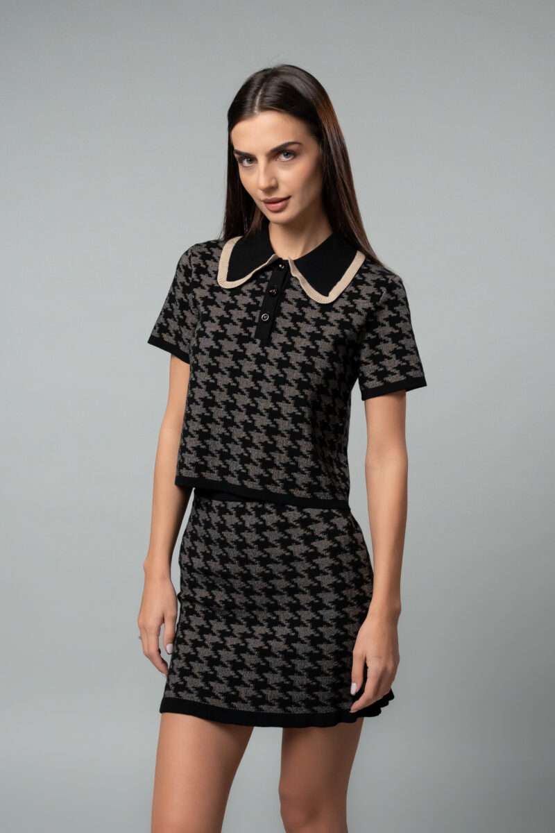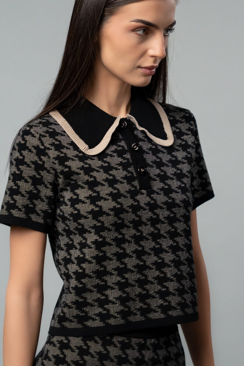 Дамска пепитена тениска от колекцията на TOTALLY ERECTED. Тениската е елегантна, изработена от меко плетиво в класически пепитен десен в черно и бежово. Моделът е с къс ръкав, стилна яка,  права кройка и изчистени кантове. Тениската има копчета в горната част – практичен детайл, придаващ характер и стил. Подходяща е, както за ежедневни, така и за по-елегантни визии. Идеално се съчетава с пепитената пола и жилетка от същата серия за завършен и стилен аутфит.