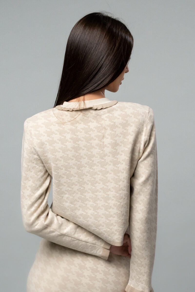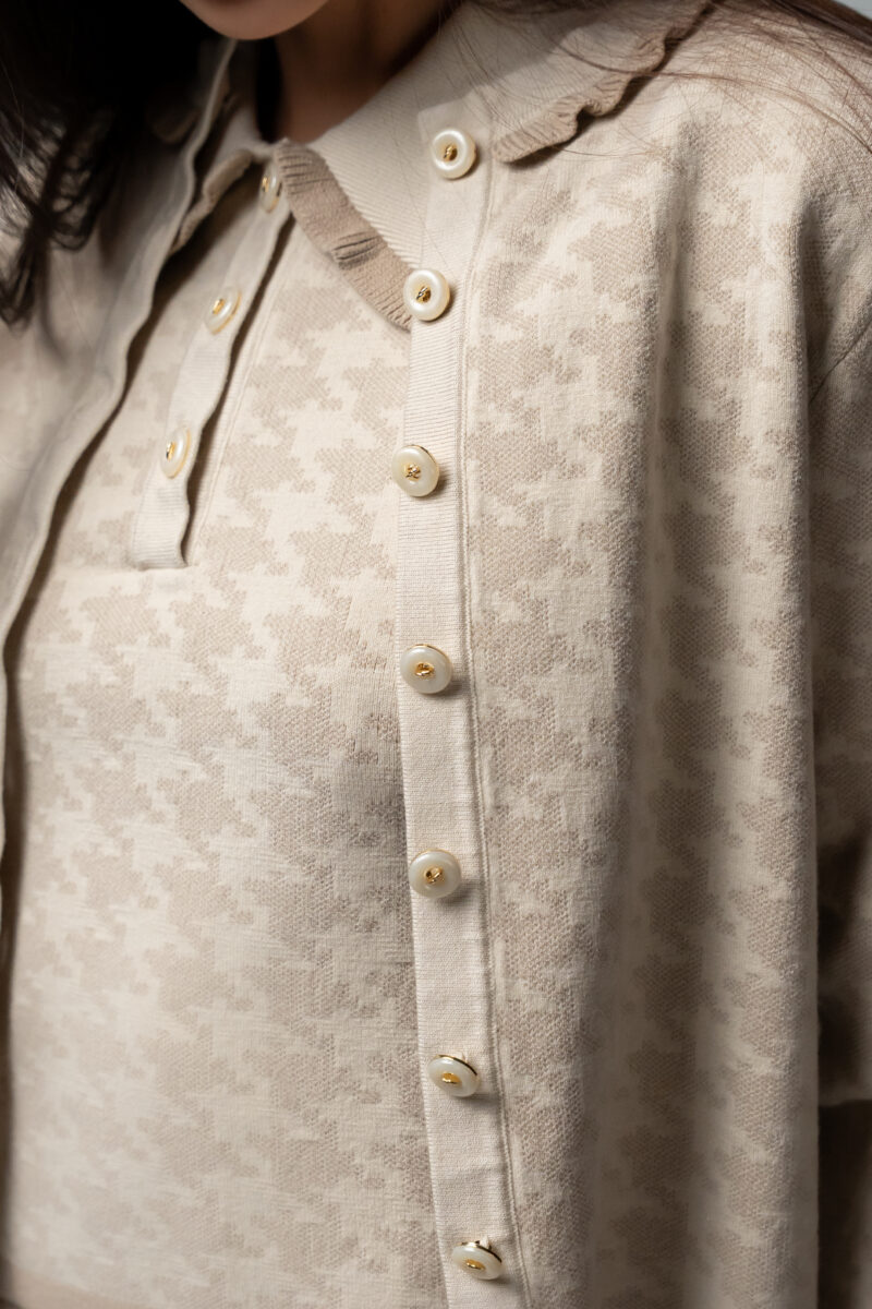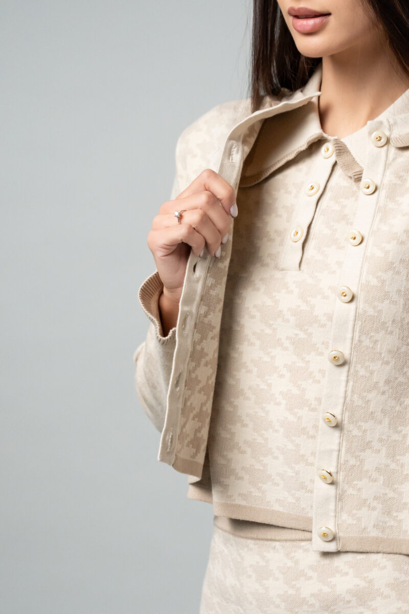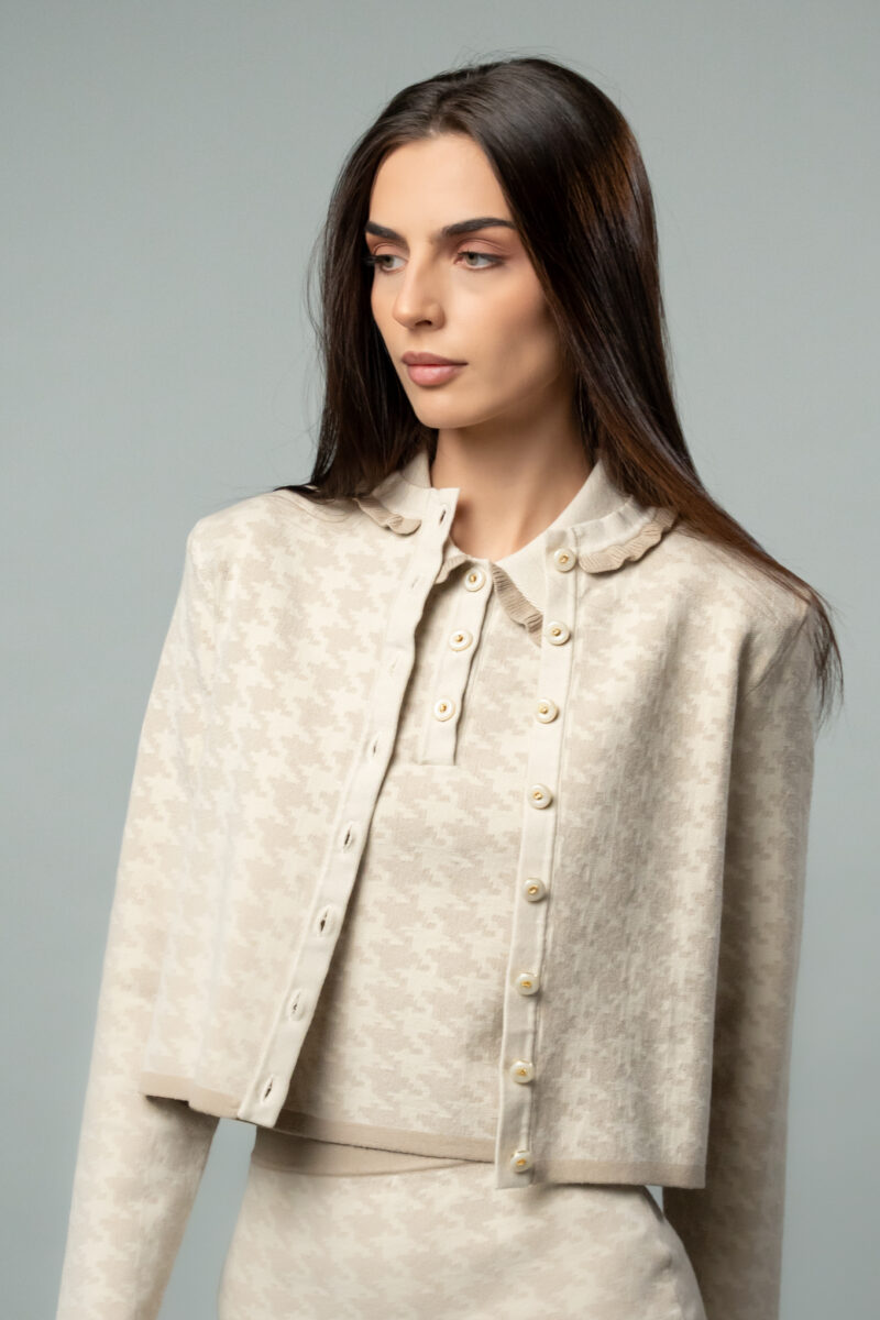 Дамска жилетка от колекцията на TOTALLY ERECTED. Жилетката е стилна, изработена от меко плетиво в класически пепитен десен в бежово. Моделът е с дълъг ръкав, права кройка и изчистени кантове. Дискретните подплънки на раменете придават структура и изискан силует, подчертавайки елегантността на визията. Закопчава се отпред с копчета, което я прави удобна за носене, както като връхна дреха, така и като част от елегантен или ежедневен аутфит. Подходяща е за комбинация с дънки, поли или панталони и е чудесен избор за пролетно-есенния сезон или за по хладни вечери.