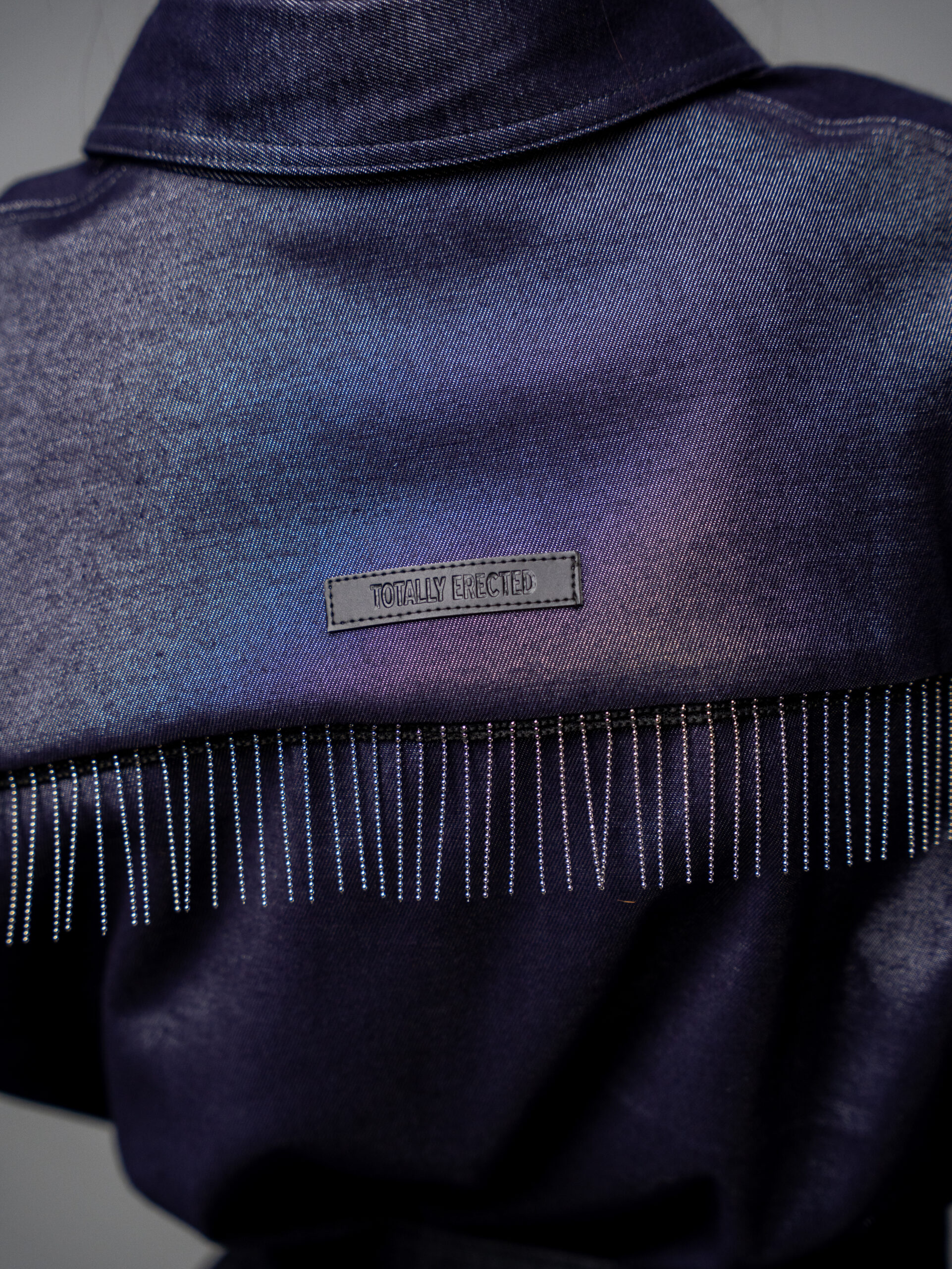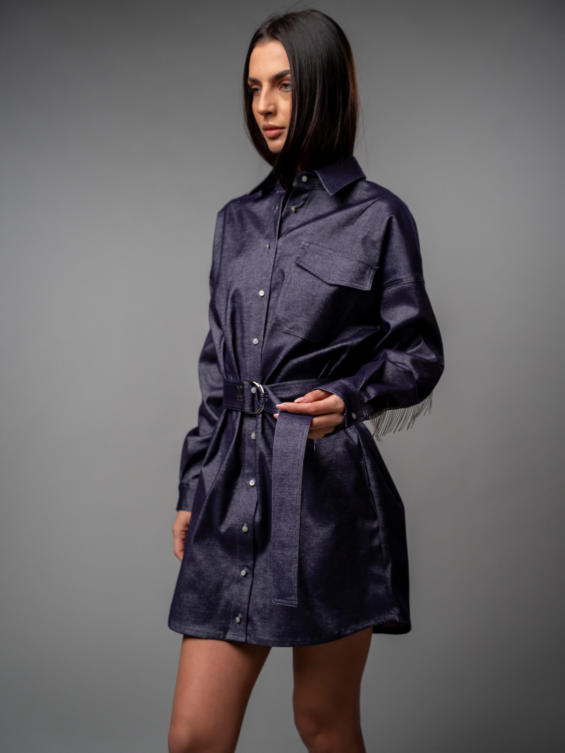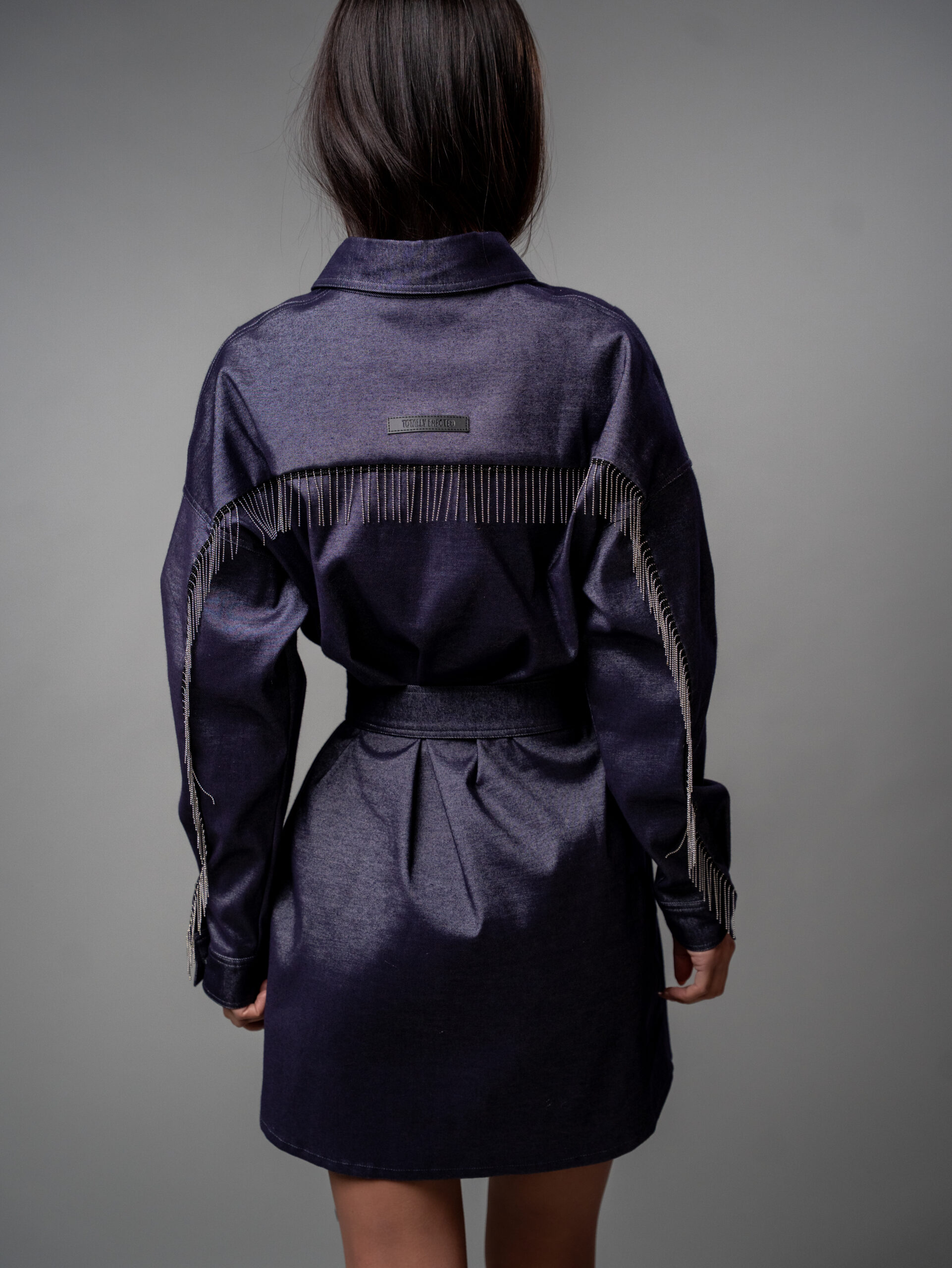 Денимова риза-рокля от Totally Erected. Моделът съчетава класически дизайн с модерен акцент. Роклята се закопчава с копчета отпред и има колан за талията, който подчертава силуета и позволява индивидуално регулиране. Акцентът са ефектните метални ресни, разположени на гърба и по продължение на ръкавите. Те се движат и създават фин, преливащ блясък, който придава отличителен и запомнящ се завършек на визията.