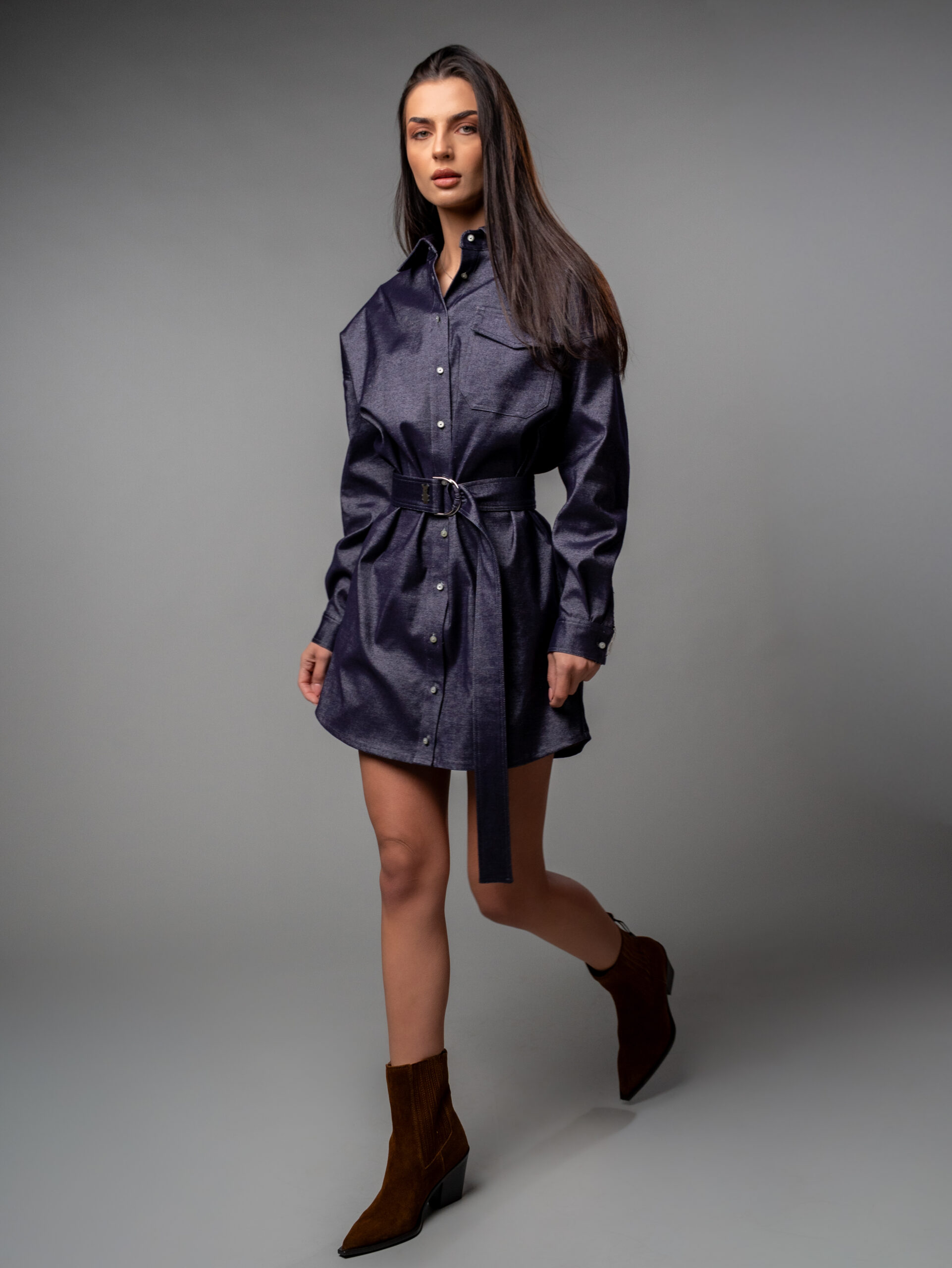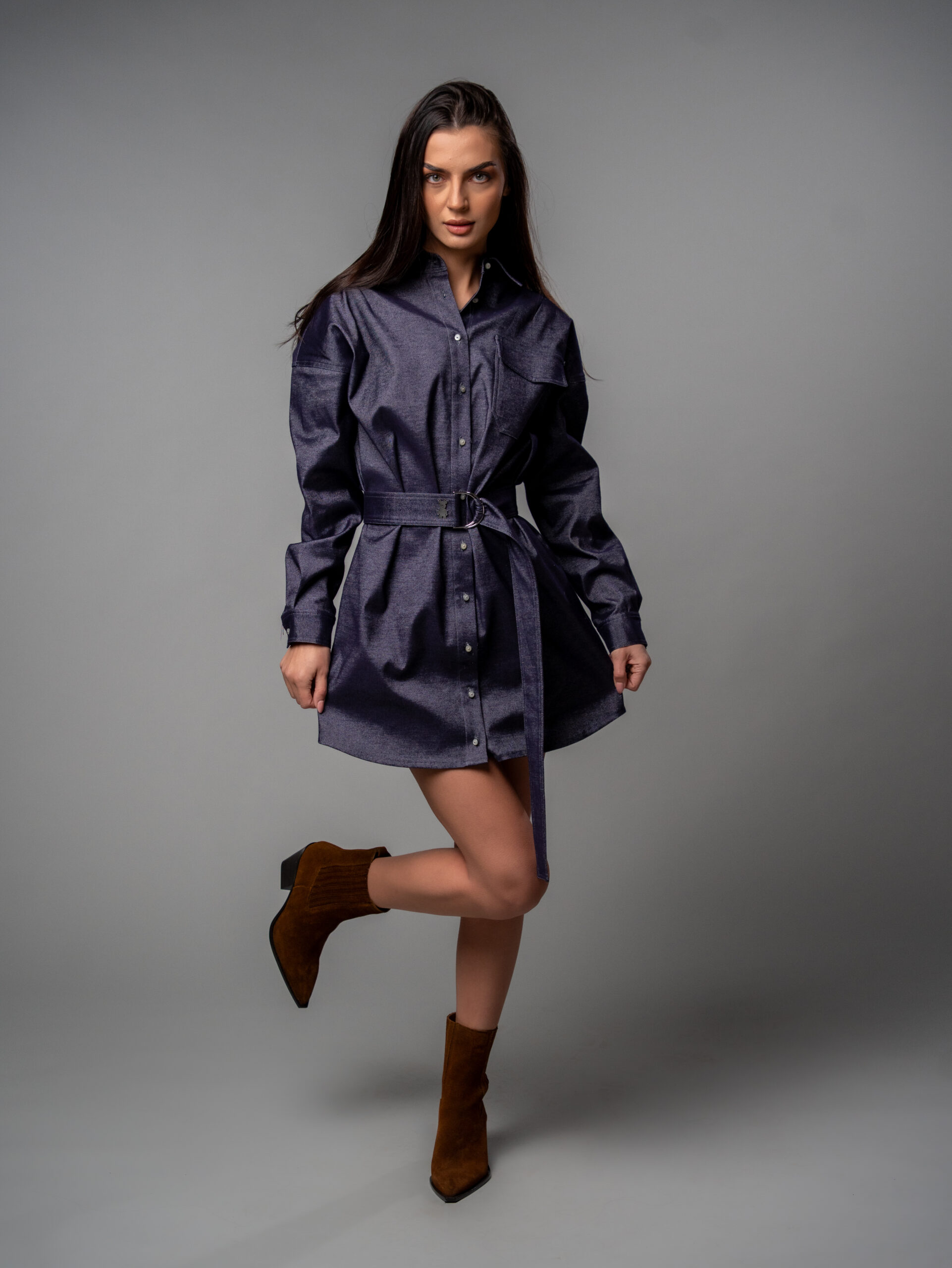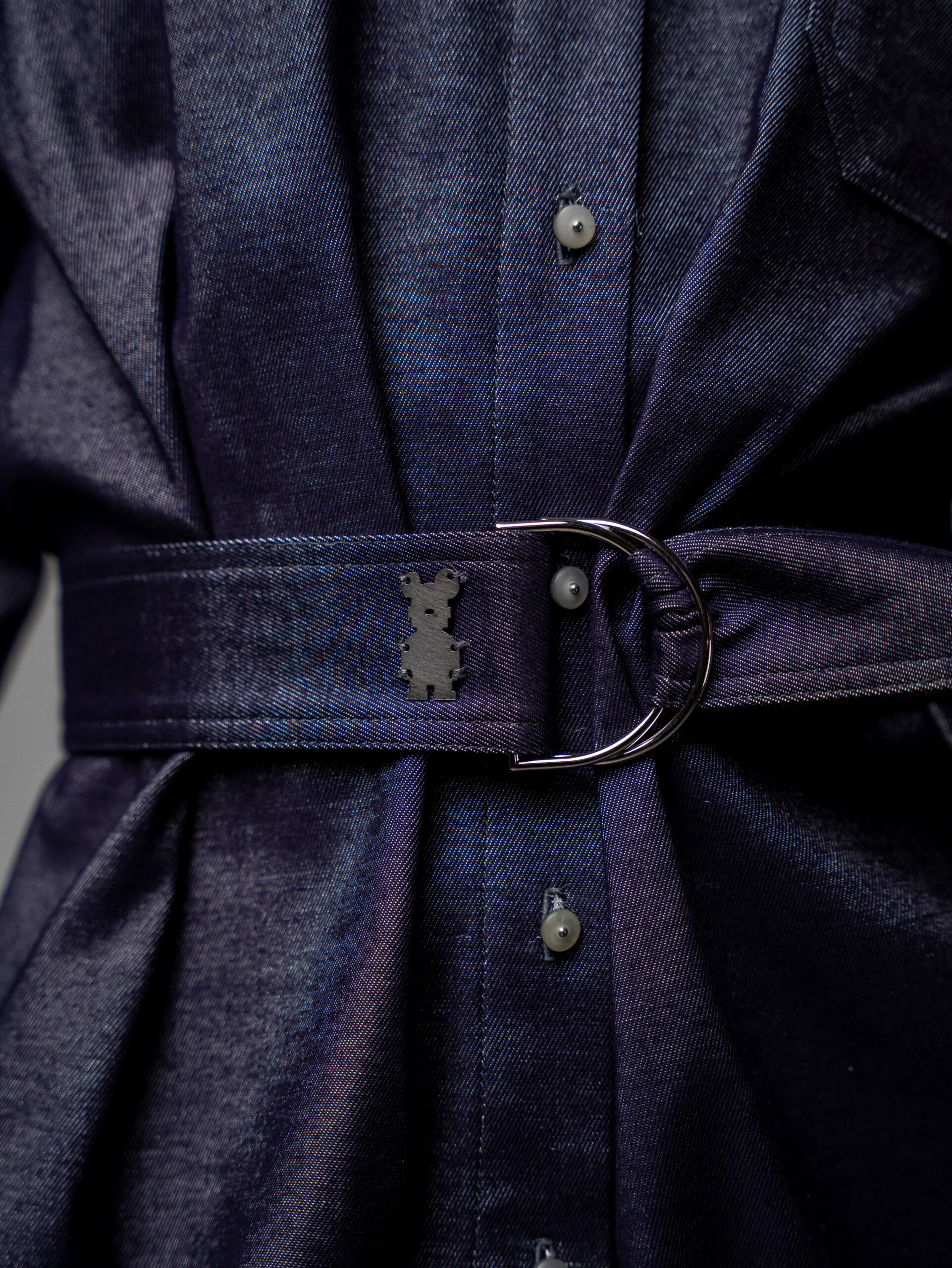 Денимова риза-рокля от Totally Erected. Моделът съчетава класически дизайн с модерен акцент. Роклята се закопчава с копчета отпред и има колан за талията, който подчертава силуета и позволява индивидуално регулиране. Акцентът са ефектните метални ресни, разположени на гърба и по продължение на ръкавите. Те се движат и създават фин, преливащ блясък, който придава отличителен и запомнящ се завършек на визията.