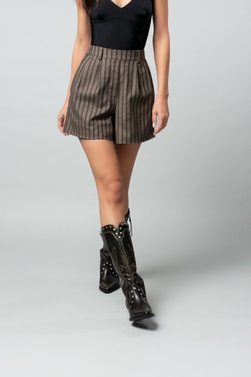 Дамски къси панталони с висока талия от TOTALLY ERECTED. Изработени от висококачествена памучна материя, късите панталони съчетават удобство и усещане за стил. Високата талия подчертава силуета и осигурява комфорт през целия ден. Моделът е с ластик на талията, но има възможност да се добави и колан. Късите панталони имат два функционални джоба отстрани, а дължината им е подходяща, както за ежедневни, така и за по-елегантни визии. Съчетават се идеално със сакото от същата серия.
