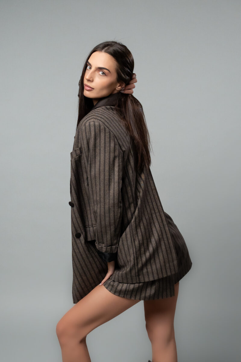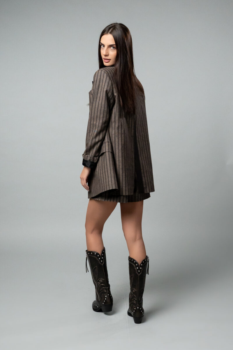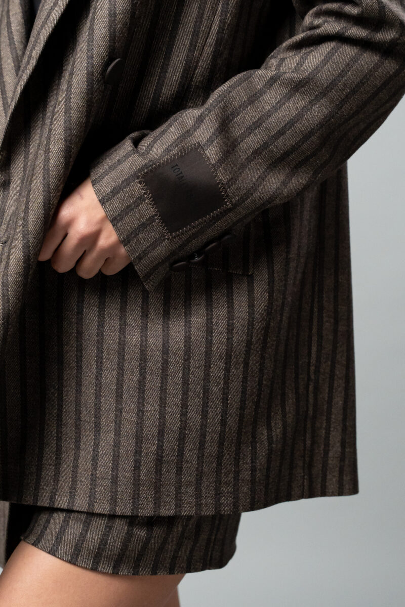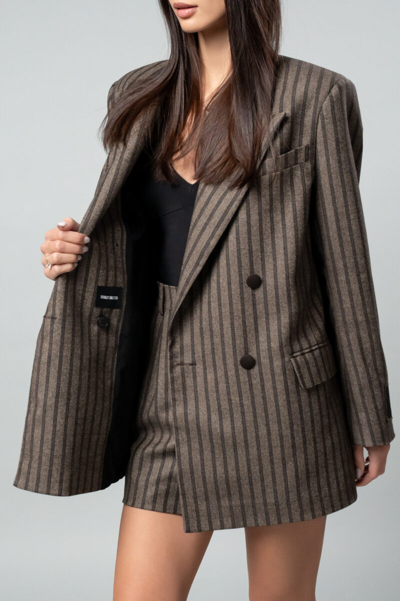Модерно и смело дамско сако от TOTALLY ERECTED. Кафяво раирано овърсайз сако, изработено от висококачествена памучна материя, която съчетава топлина и елегантност. Силуетът е свободен, с подчертани рамене, благодарение на подплънките, които придават структура и характер на визията. Сакото се закопчава отпред с копче, ръкавите са украсени с декоративни копчета и е пришито логото на бранда. Моделът има два функционални джоба отстрани и един малък горен джоб. Акцентът  е дълбока цепка, стигаща до средата на гърба, който гарантира, че ще се откроявате и няма да останете незабелязана. Сакото се комбинира отлично с панталони, поли  и ролки. Идеално се съчетава с късите панталони от същата серия.
