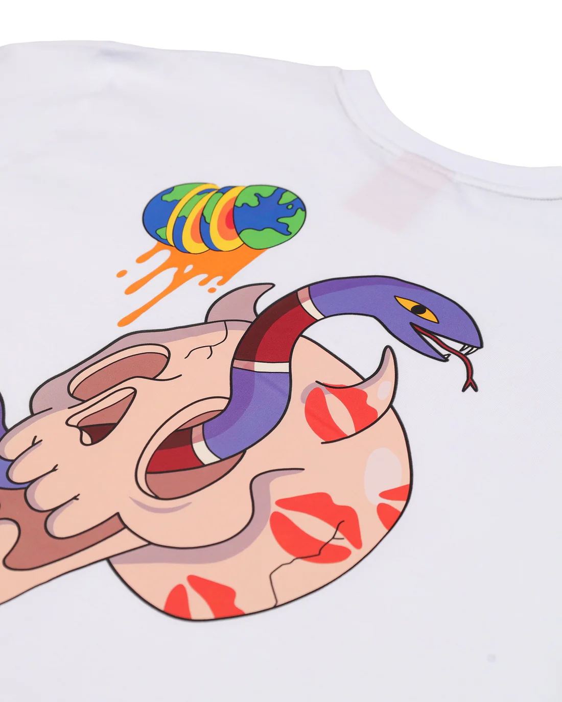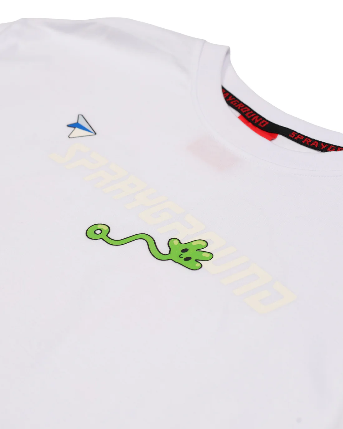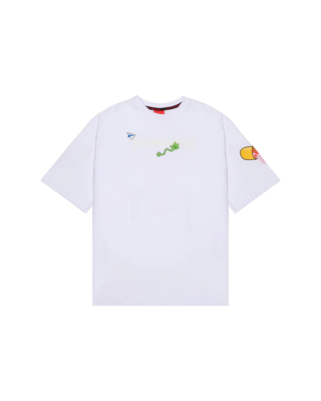 Бяла памучна овърсайз тениска от Sprayground с отличителен дизайн и силно присъствие. Моделът е изработен от висококачествен памук, осигуряващ комфорт през целия ден. На гърба е разположен голям цветен принт, който придава смел и артистичен вид. Отпред тениската е завършена с малък акцентен принт за балансирана визия.