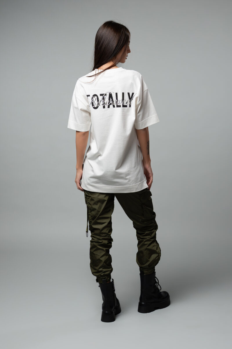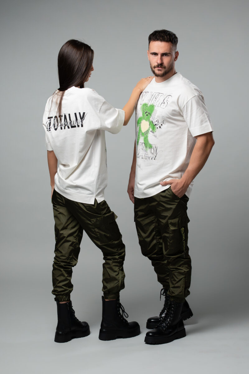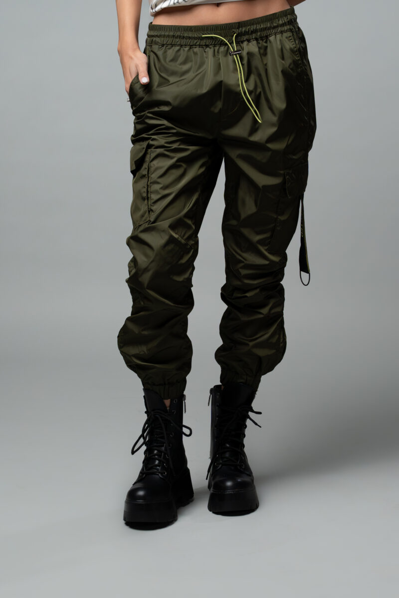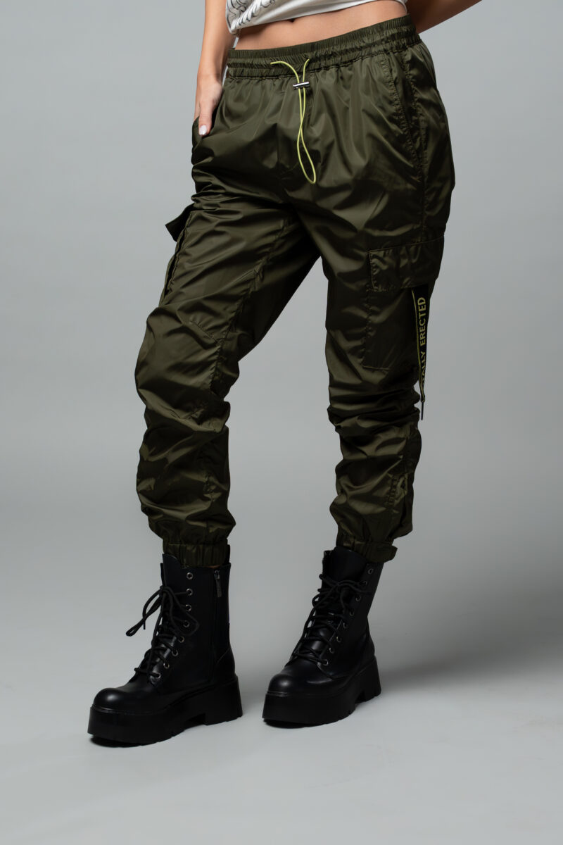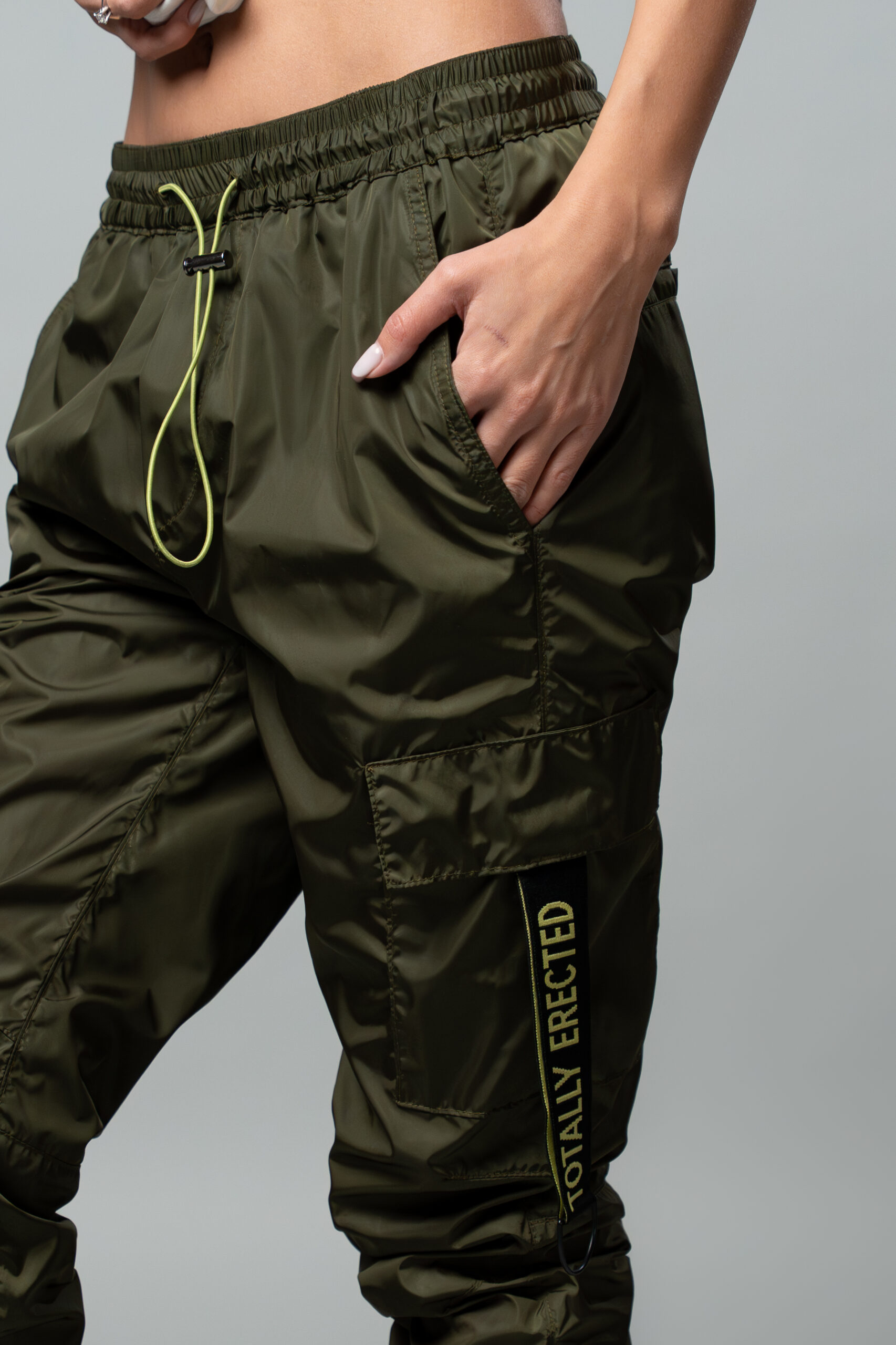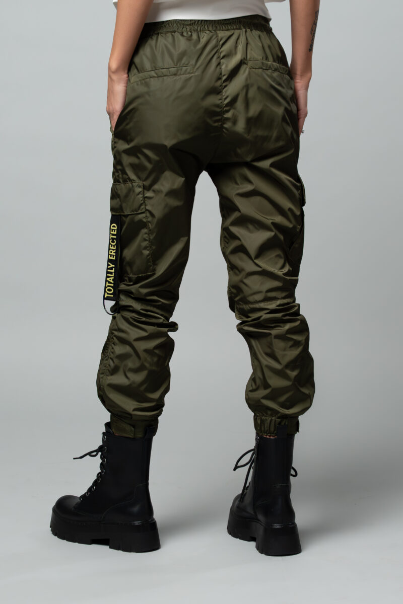 Дамски карго панталон от TOTALLY ERECTED в черен цвят. Панталонът е изработен от шушлякова материя, завършен е с пристягащи се ластици на талията и велкро лента в долната част на крачола. Има два джоба отред, два отзад и два джоба отстрани, като единият е с брандиран акцент.